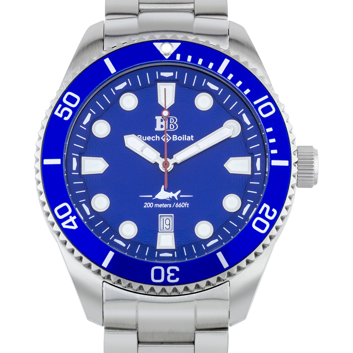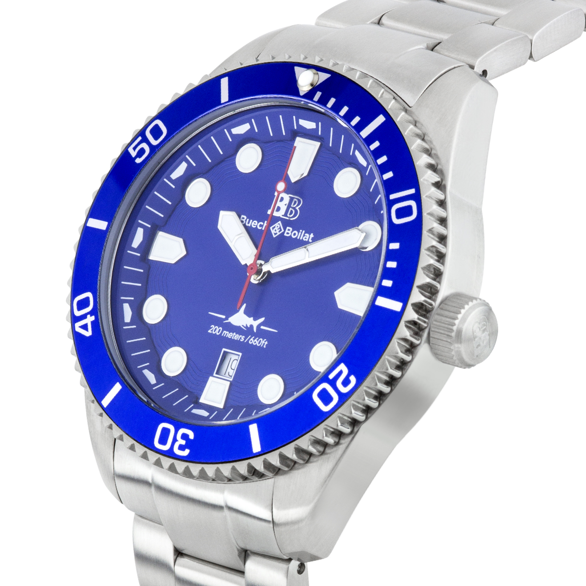 The Buech & Boilat Thresher Men's Swiss Diver Watch features a silver bracelet, silver case, blue bezel, and blue dial. Please see photos for details.