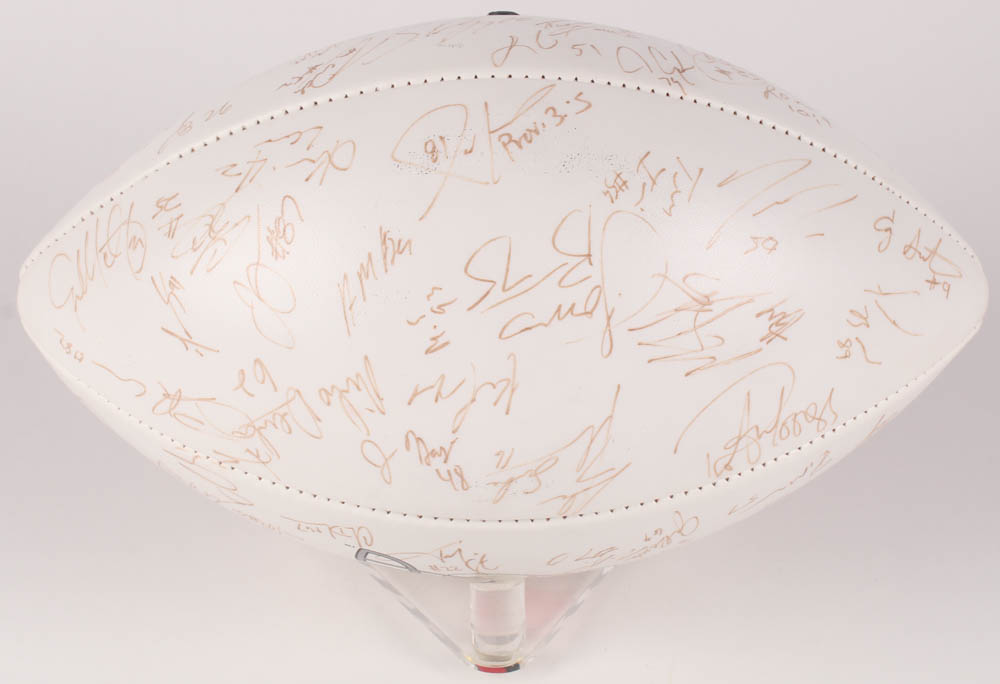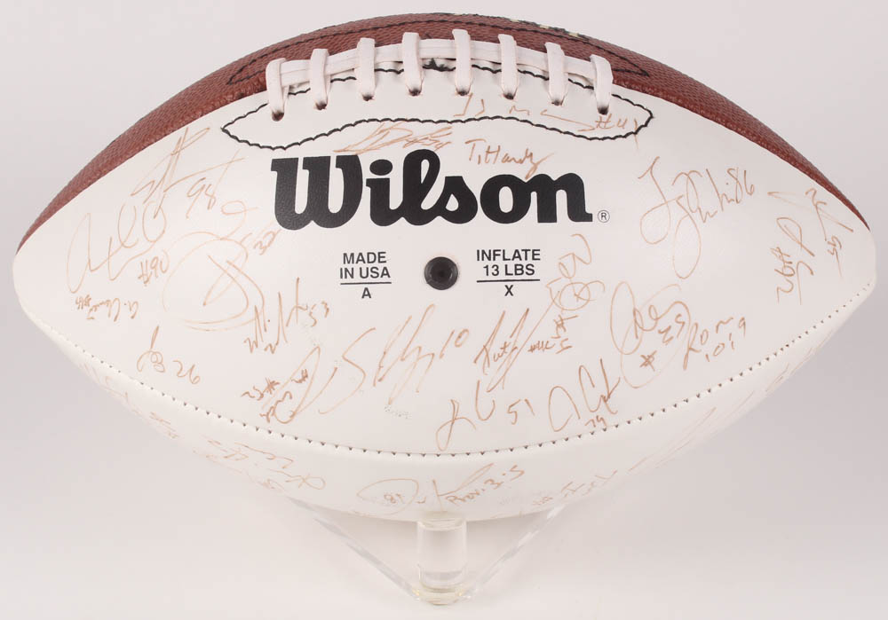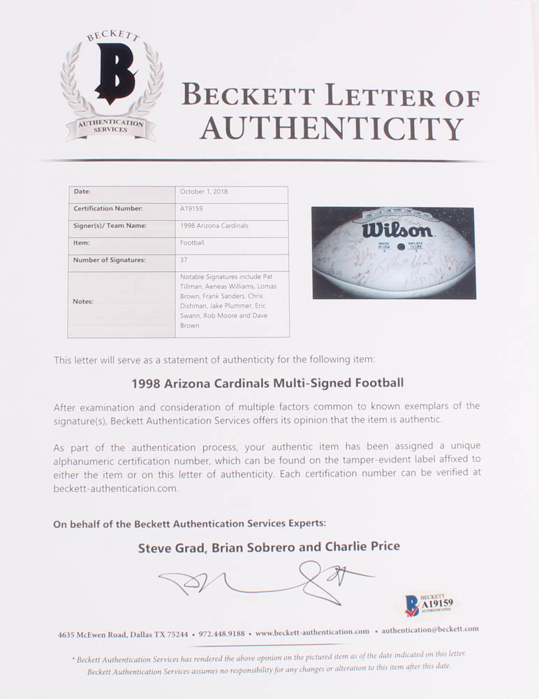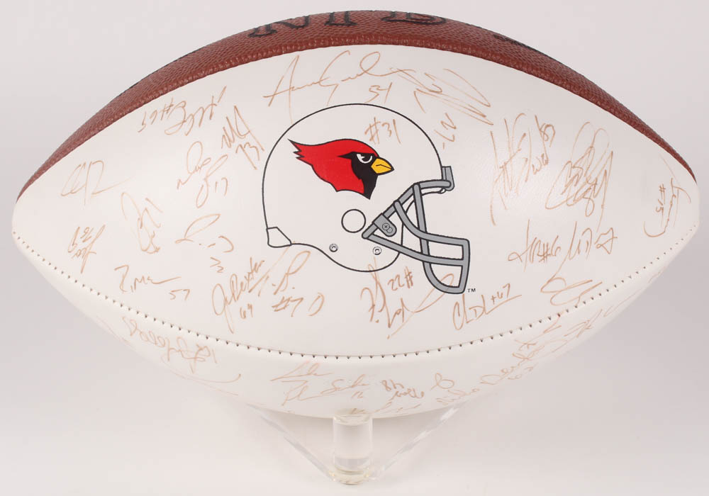 Arizona Cardinals Logo Fooball. Hand-signed in black felt-tip pen by Pat Tillman, Aeneas Williams, Lomas Brown, Frank Sanders, Jake Plummer, Chris Dishman, Eric Swann, Rob Moore, Dave Brown, and others.