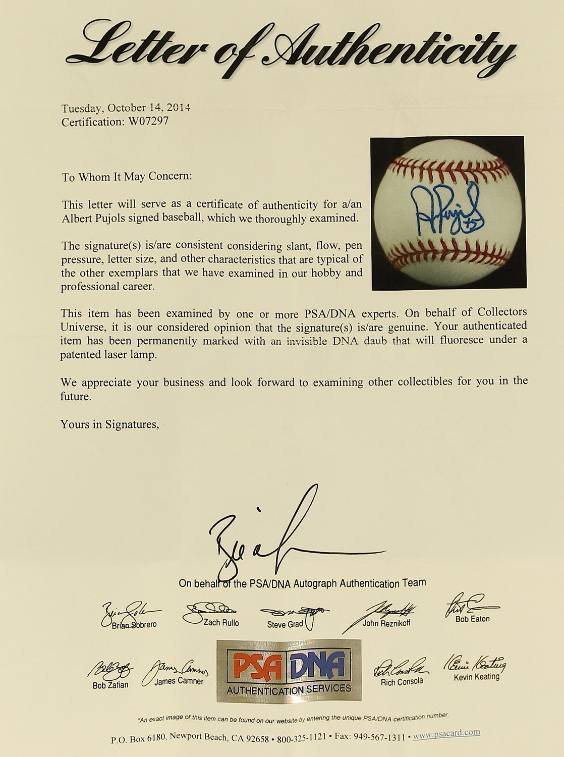 Official Major League baseball. Hand-signed in blue ink pen by Albert Pujols (Cardinals). The autograph includes an official PSA/DNA hologram and matching LOA for authenticity purposes.