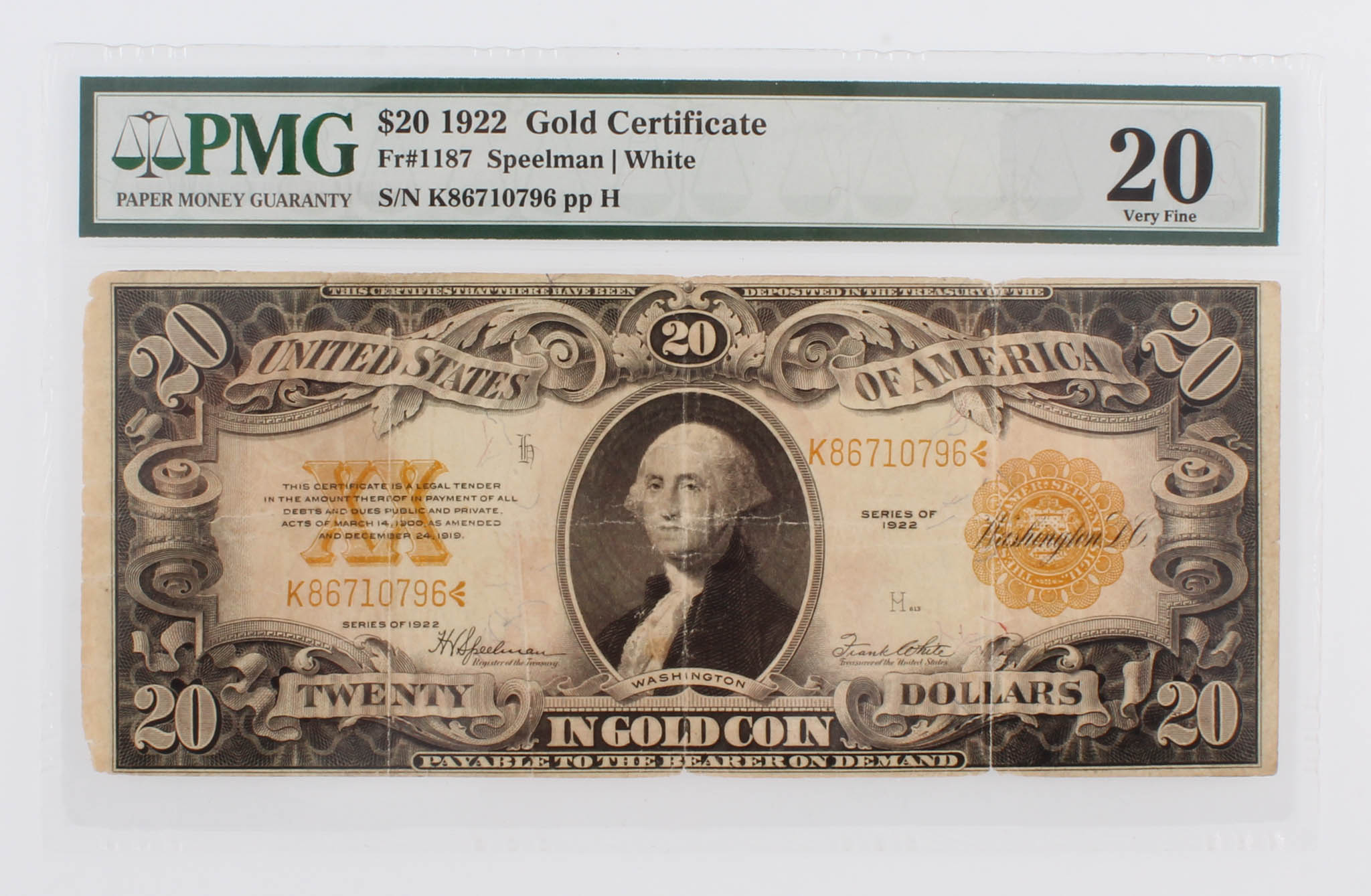 1922 $20 Twenty Dollars U.S. Gold Certificate Large Size Bank Note (PMG 20)