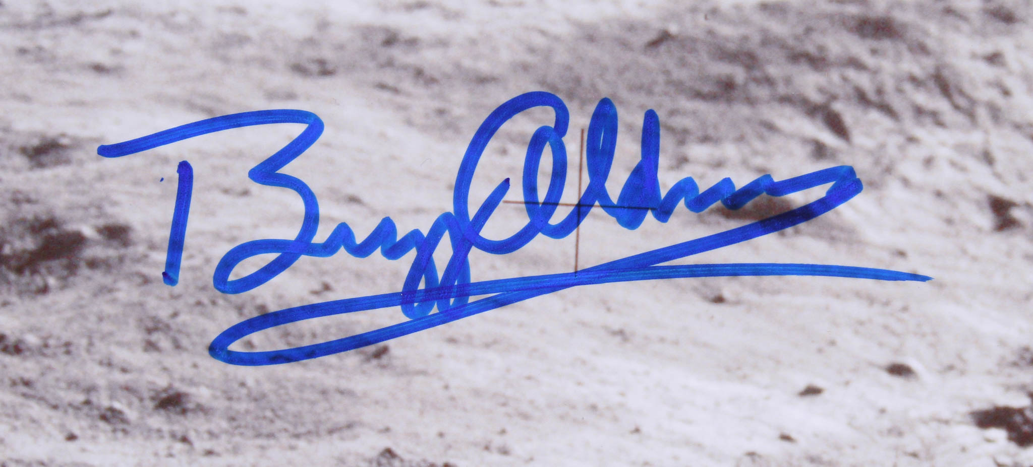 Photo measures 16" x 20" in size and has been hand-signed in bue felt-tip pen by Buzz Aldrin.