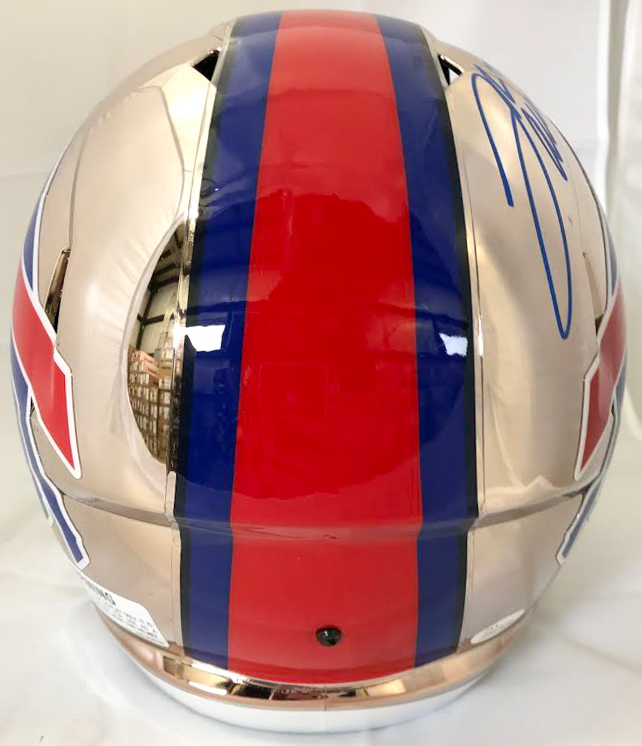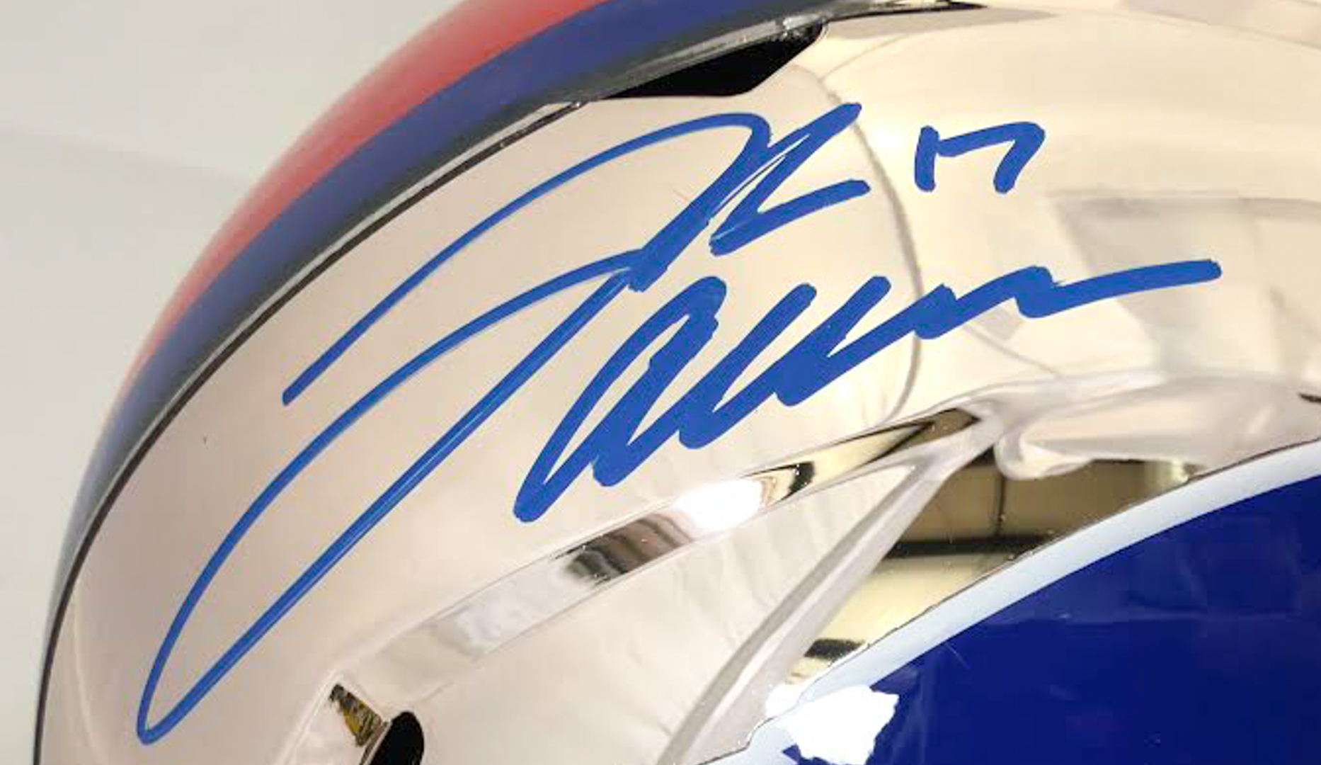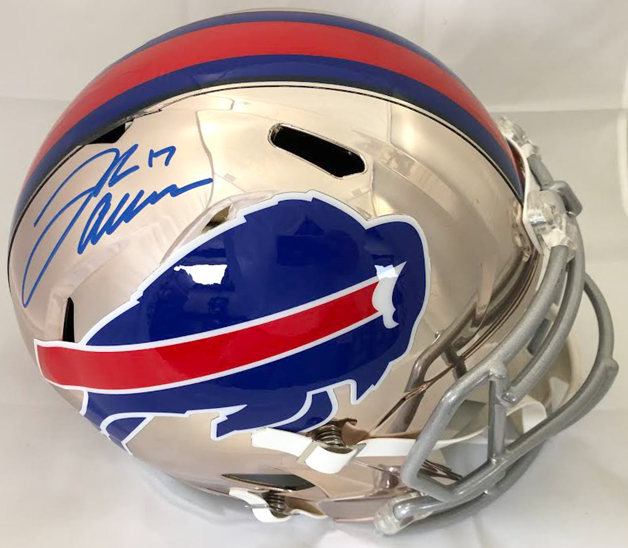 Riddell Buffalo Bills full-size replica chrome speed helmet. Hand-signed in blue paint pen by Josh Allen.