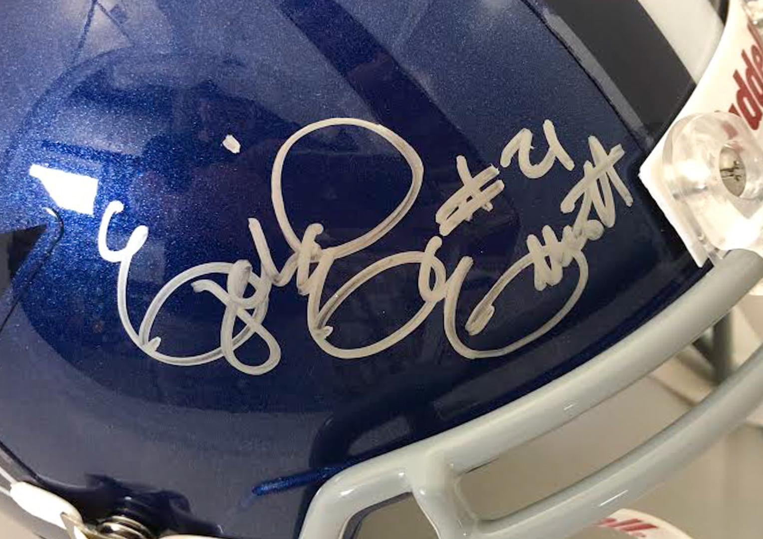 Dallas Cowboys full-size helmet has been hand-signed in silver paint pen by Ezekiel Elliott.