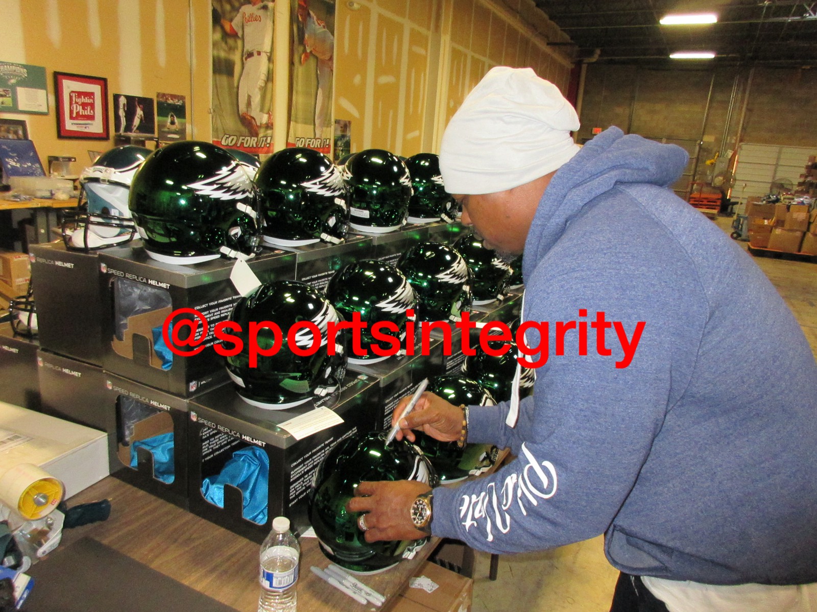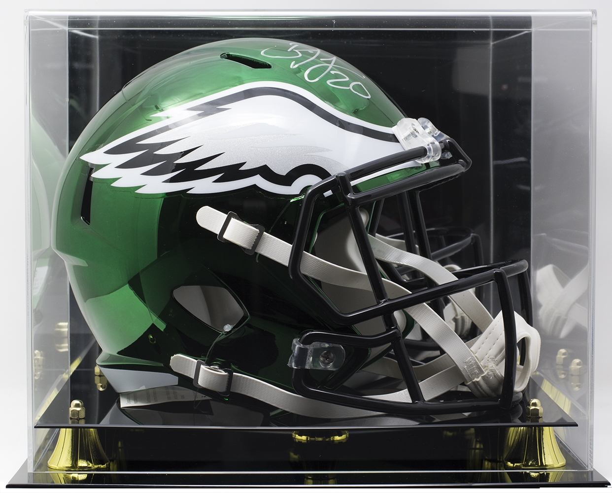 Philadelphia Eagles full-size chrome replica speed helmet. Hand-signed and inscribed in silver paint pen by Brian Dawkins (HOF). Auction includes a deluxe acrylic display case.