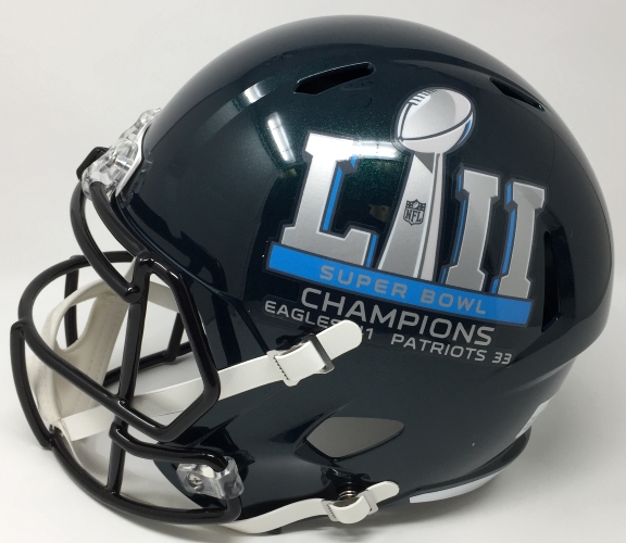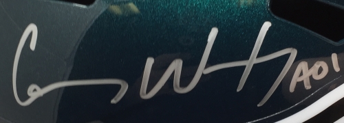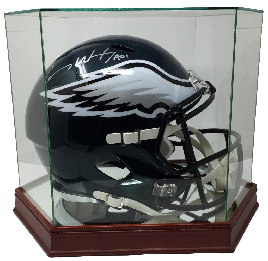 Philadelphia Eagles full-size authentic on-field helmet. Hand-signed and inscribed in silver paint pen by Carson Wentz. Auction includes a high quality display case with a wooden base.