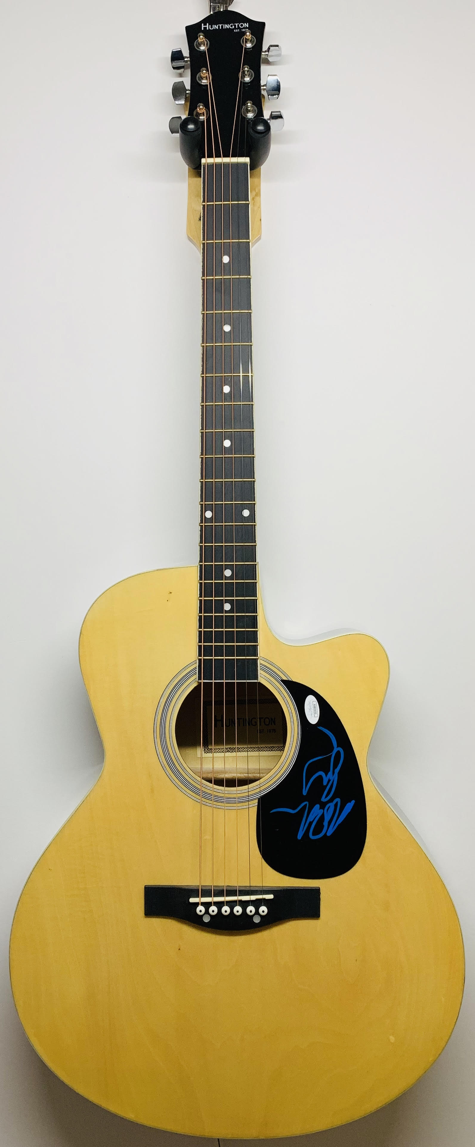 Full sized Huntington natural acoustic guitar, hand signed on the pick guard by Norah Jones, in blue paint pen.