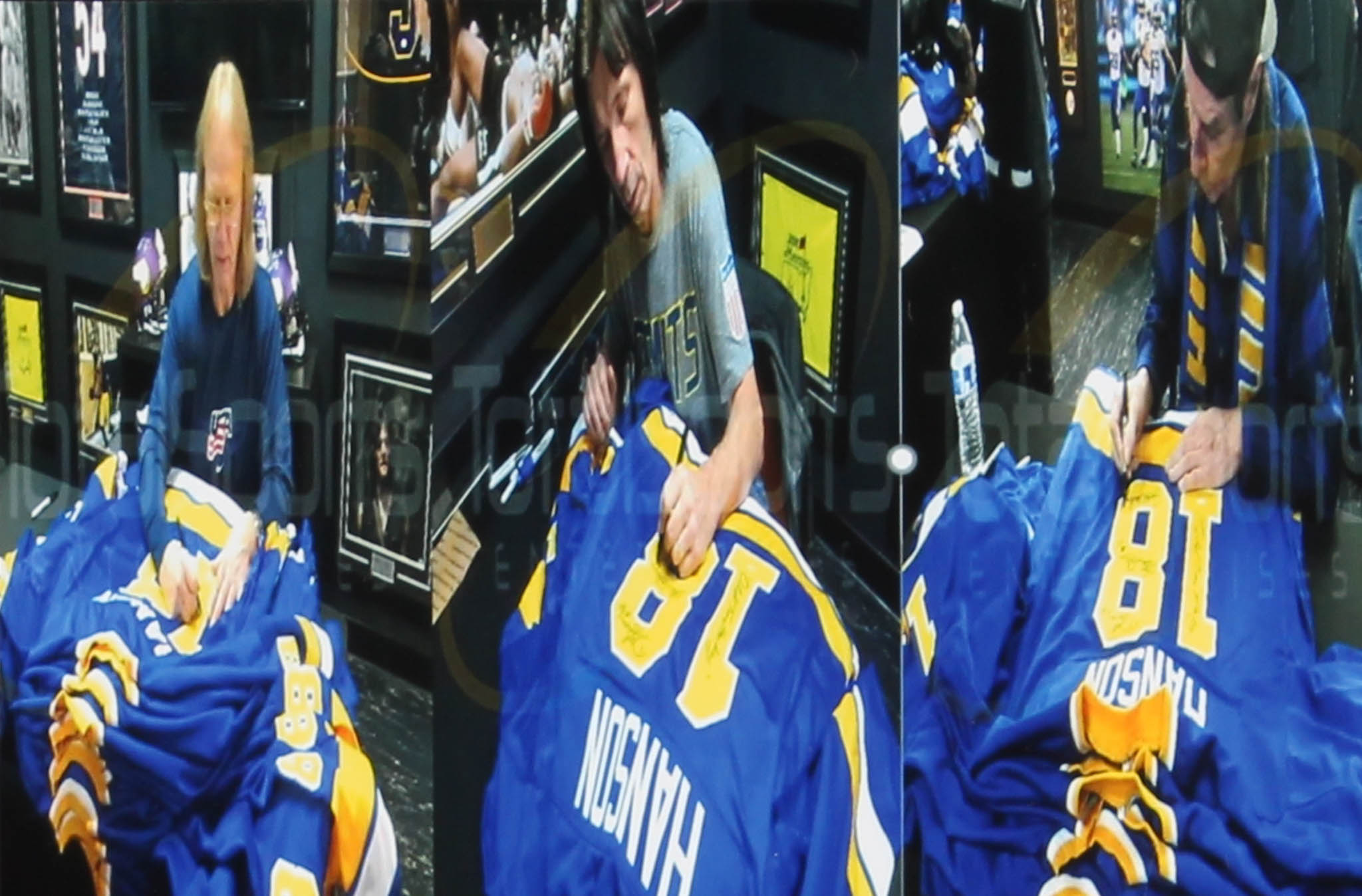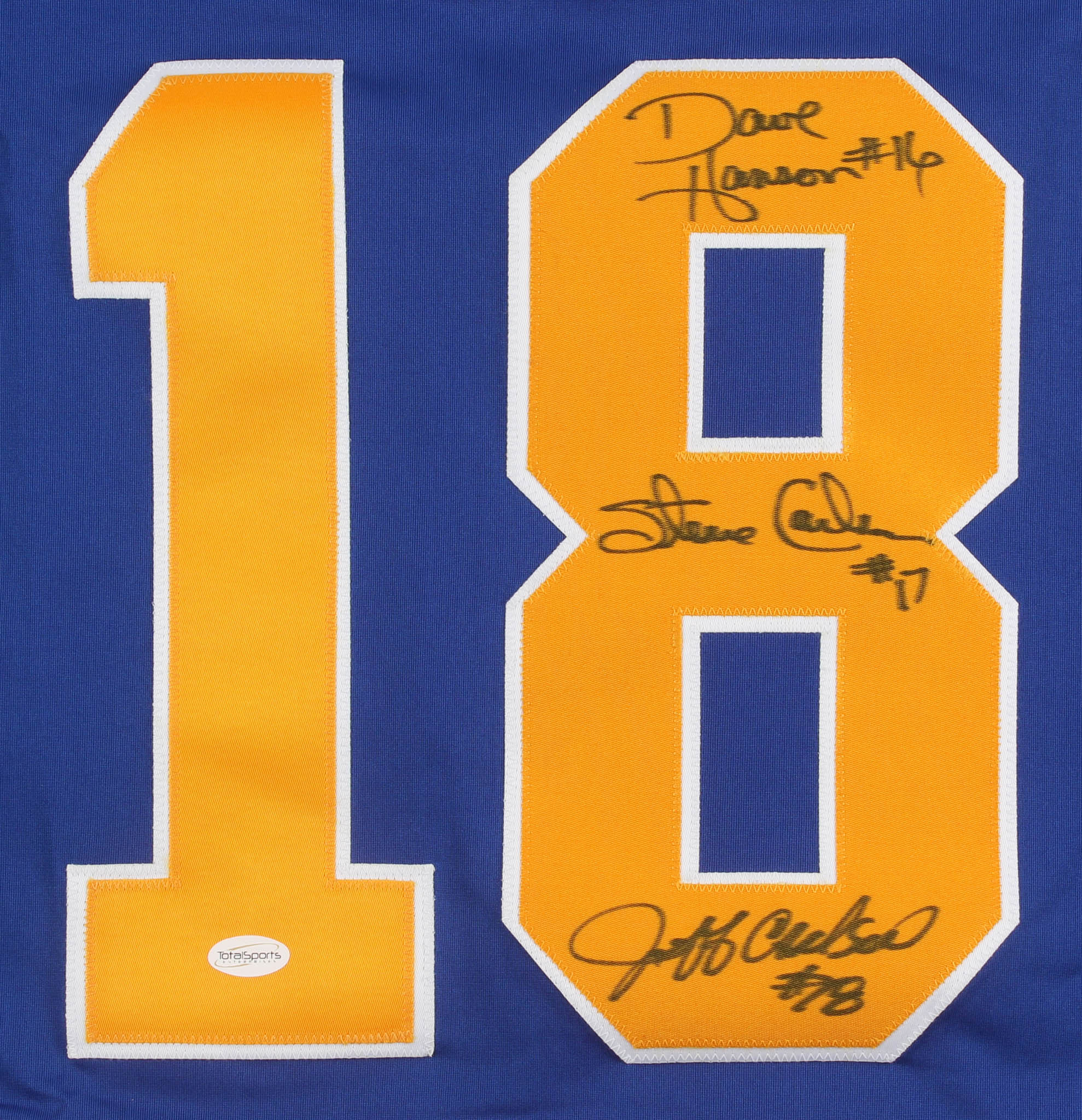 Custom on-ice style jersey. Everything is sewn on, size XL. Hand-signed in black felt-tip pen by David Hanson (Jack Hanson), Jeff Carlson (Jeff Hanson) and Steve Carlson (Steve Hanson).