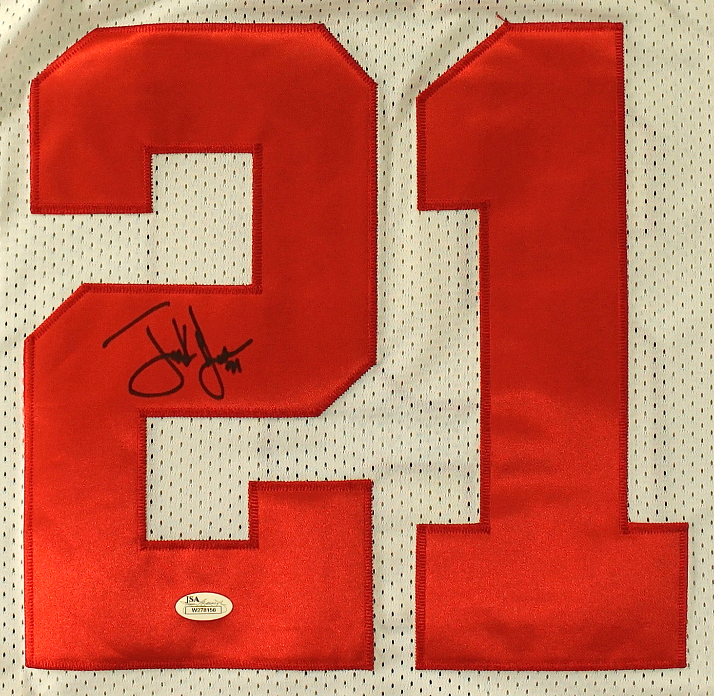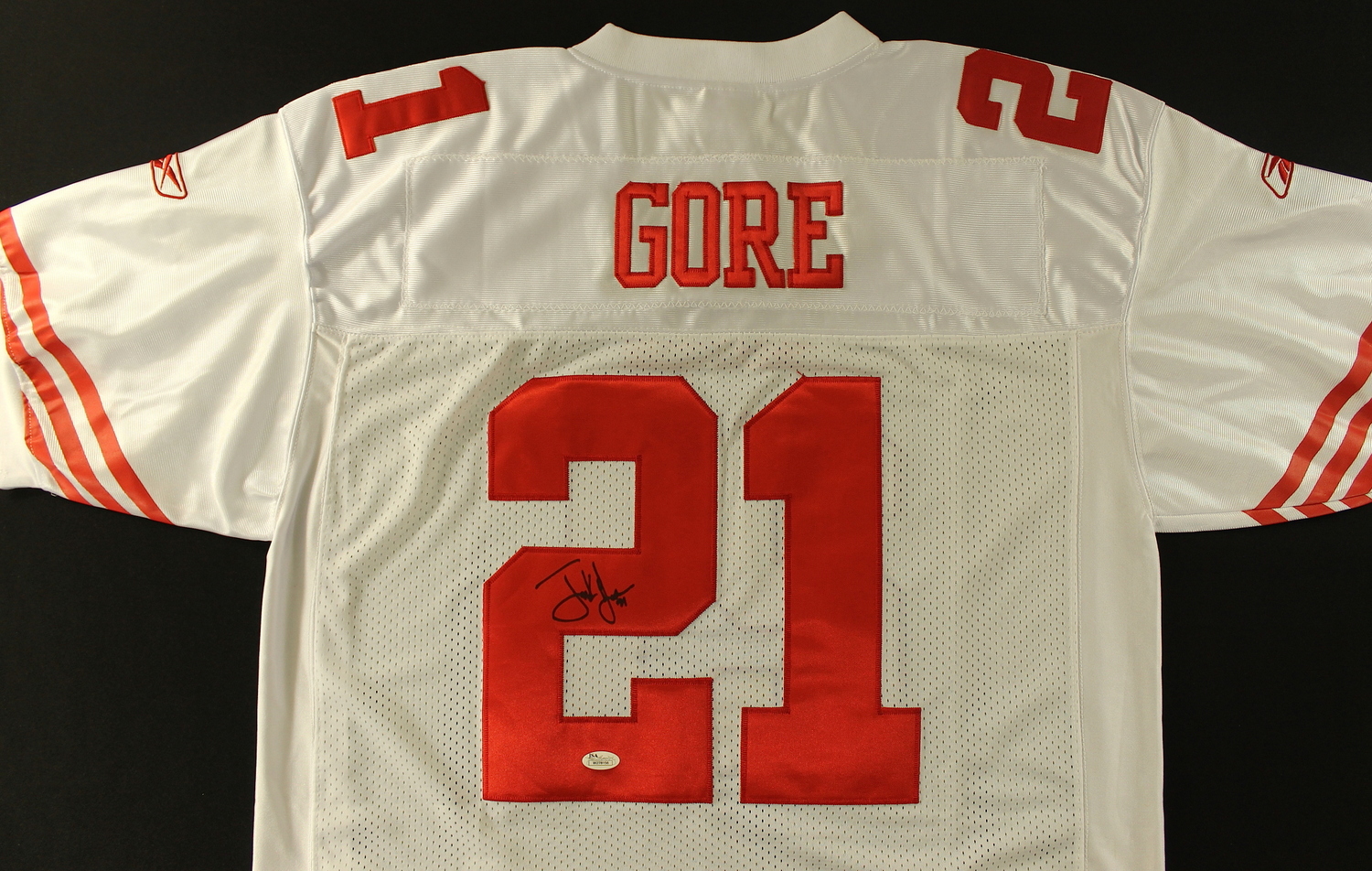 Reebok on-field style jersey. Everything sewn on, size 50. Hand-signed in black felt tip pen by Frank Gore. The autograph includes an official James Spence Authentication (JSA) hologram for authenticity purposes. The signing of this item was witnessed by JSA.