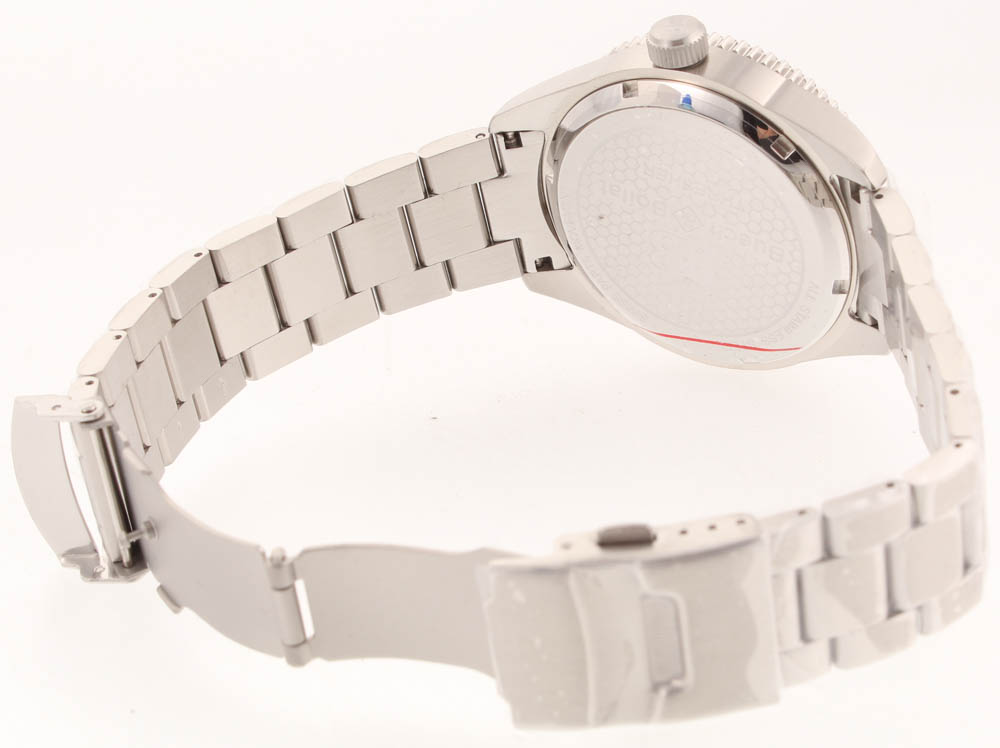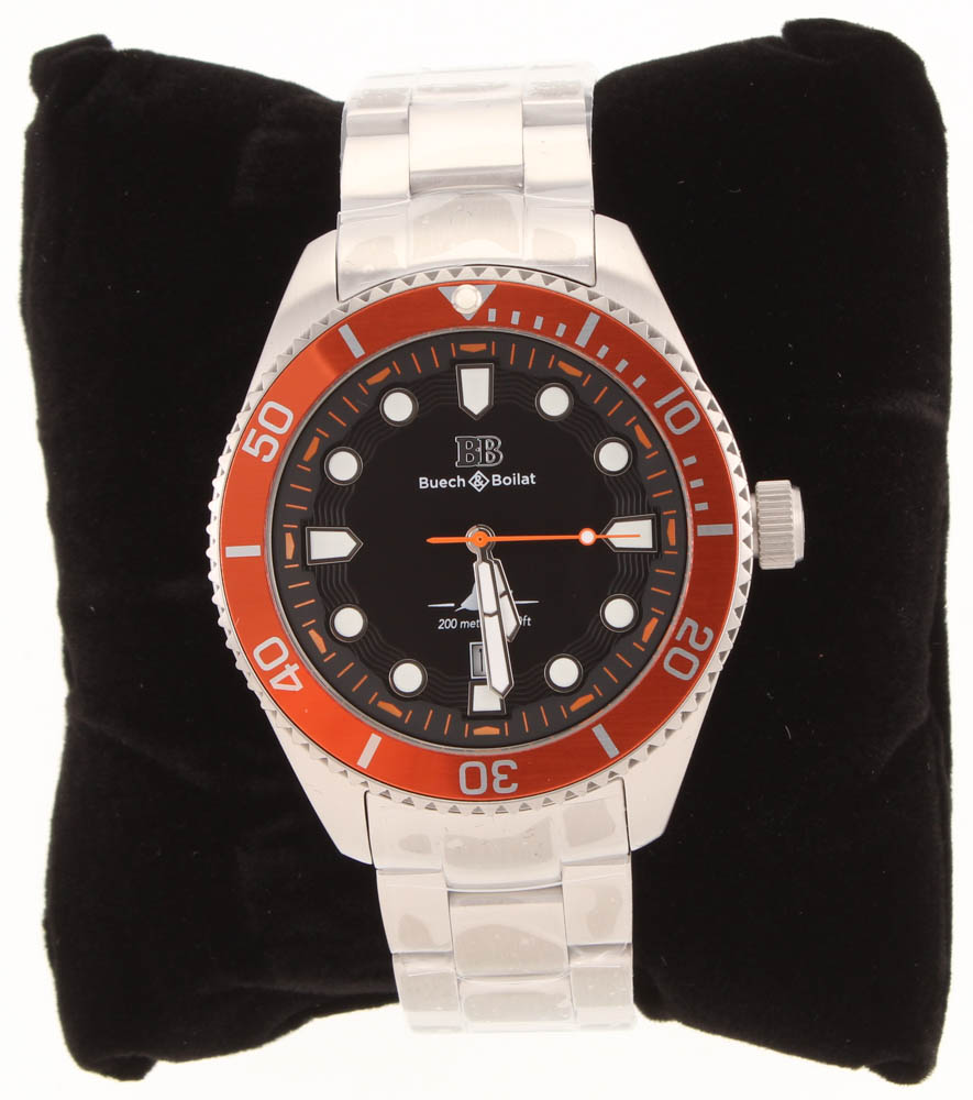 The Buech & Boilat Thresher Men's Swiss Diver Watch features a silver bracelet, silver case, orange bezel, and black dial. Please see photos for details.