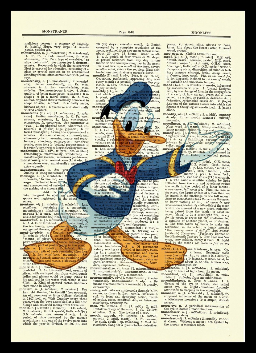 This piece measures approximately 8" x 10" in size. A unique antique dictionary page is used as the canvas giving the print a great vintage look and making this piece a genuine one-of-a-kind collectible.