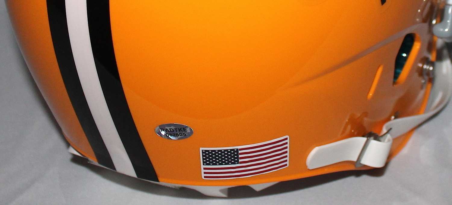 Schutt full-size throwback helmet. Hand-signed and inscribed in black felt-tip pen by Ray Guy (HOF, Raiders). The autograph includes an official Radtke Sports hologram and matching COA for authenticity purposes. Also includes proof picture from the signing.