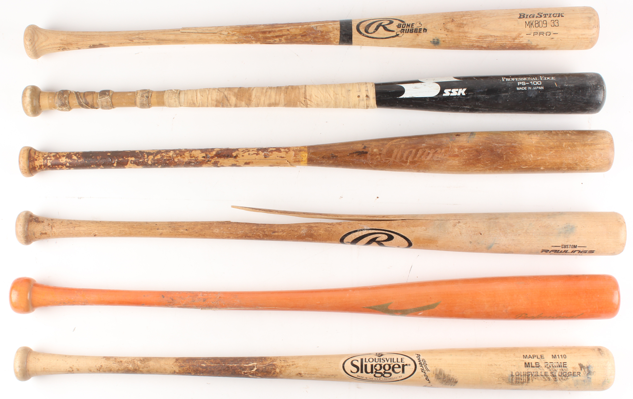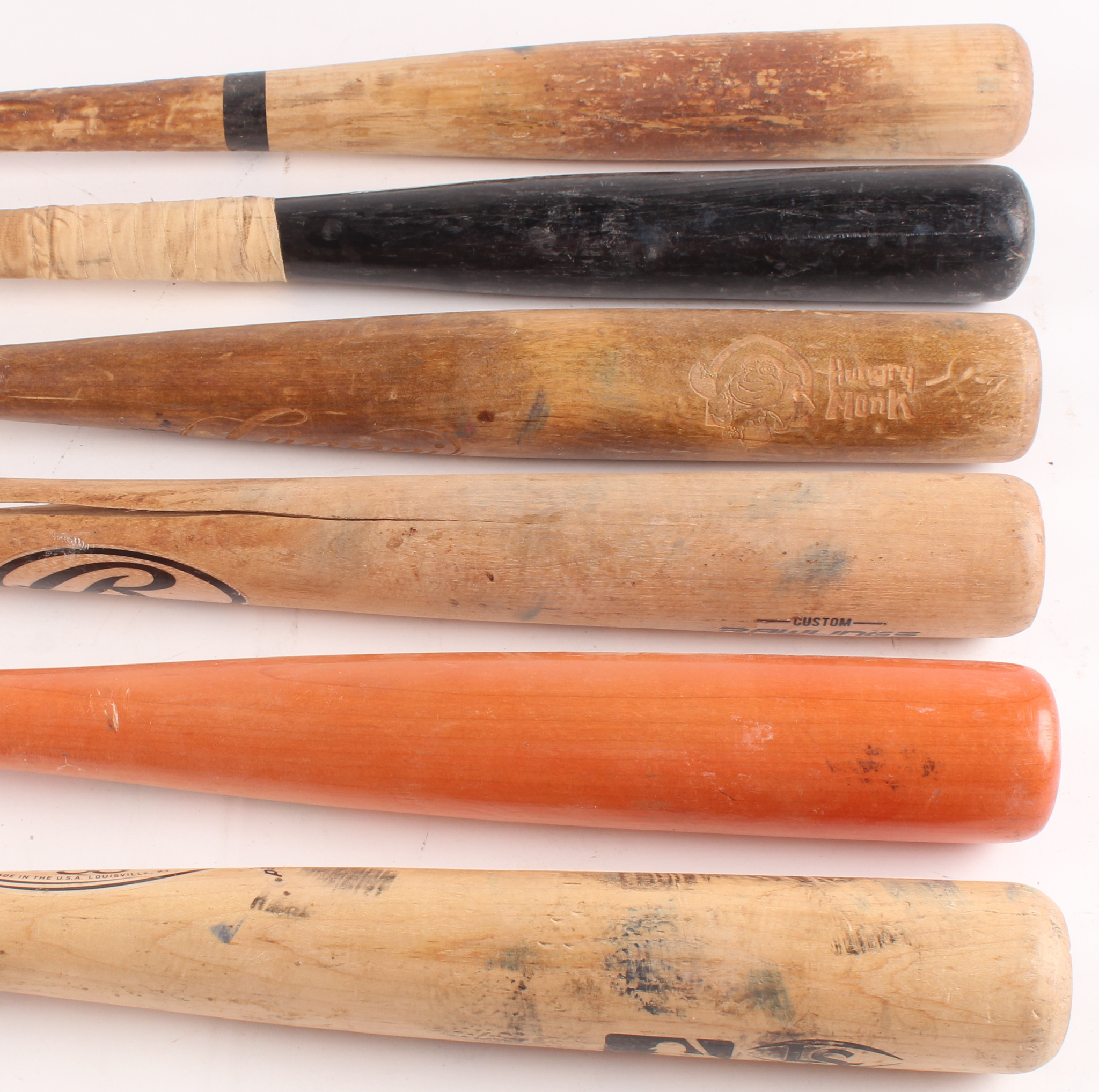 Lot includes all (6) Assorted game-used baseball bats. Lot includes (2) Rawlings baseball bats, (1) Louisville Slugger, (1) SSK, (1) Hungry Monk & (1) Mizuno baseball bats. Baseball bats have been cracked and used by unknown players. Please see photos for details regarding the condition of the baseball bats.