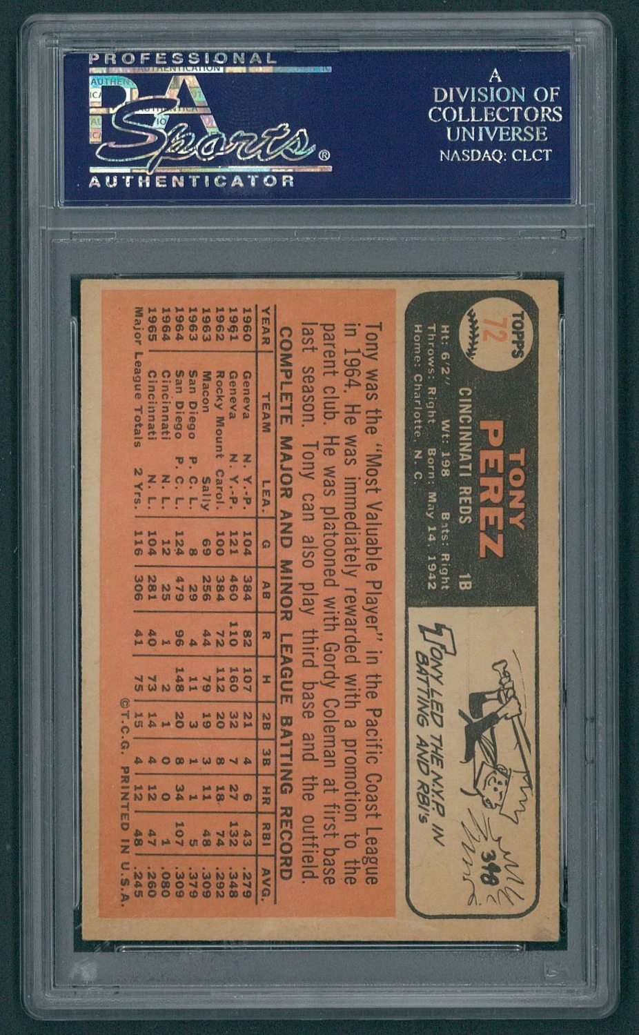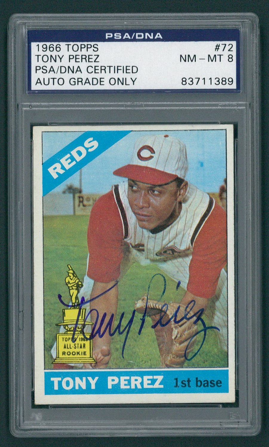 1966 Topps #72 Tony Perez Baseball Card. Hand-signed in blue felt tip pen by Tony Perez (Reds HOF). Autograph has been certified and encapsulated by PSA/DNA for authenticity purposes. The autograph has been graded NM MT 8 by PSA.