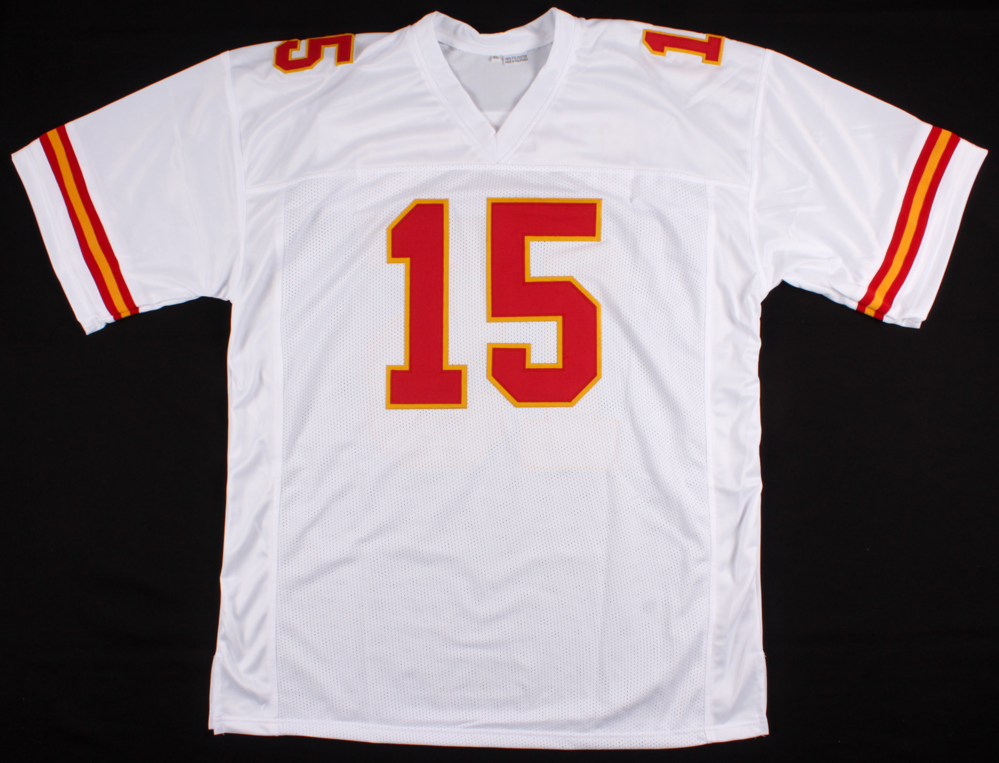 Custom on-field style jersey. Everything is sewn on, size XL. Hand-signed in black felt-tip pen by Patrick Mahomes.