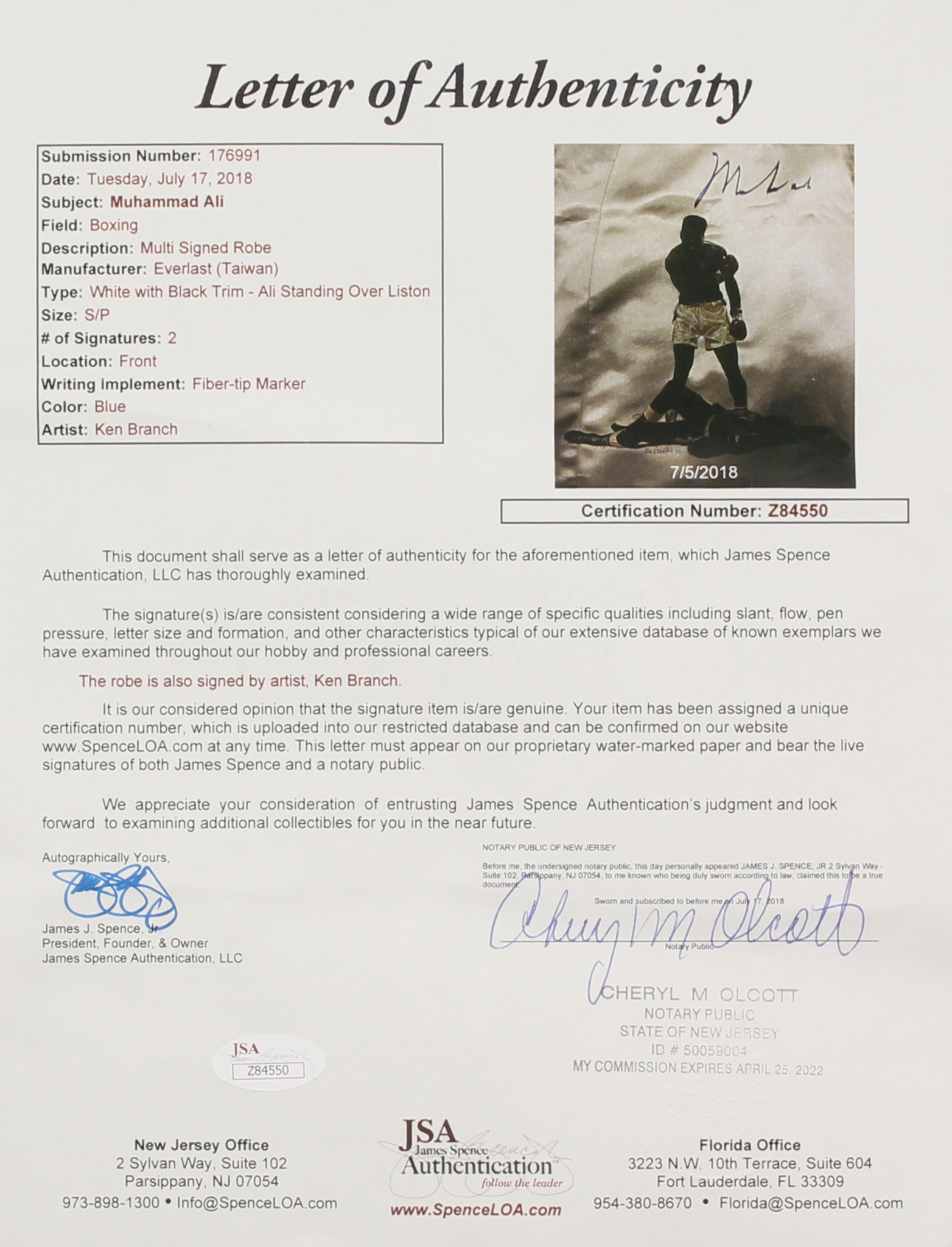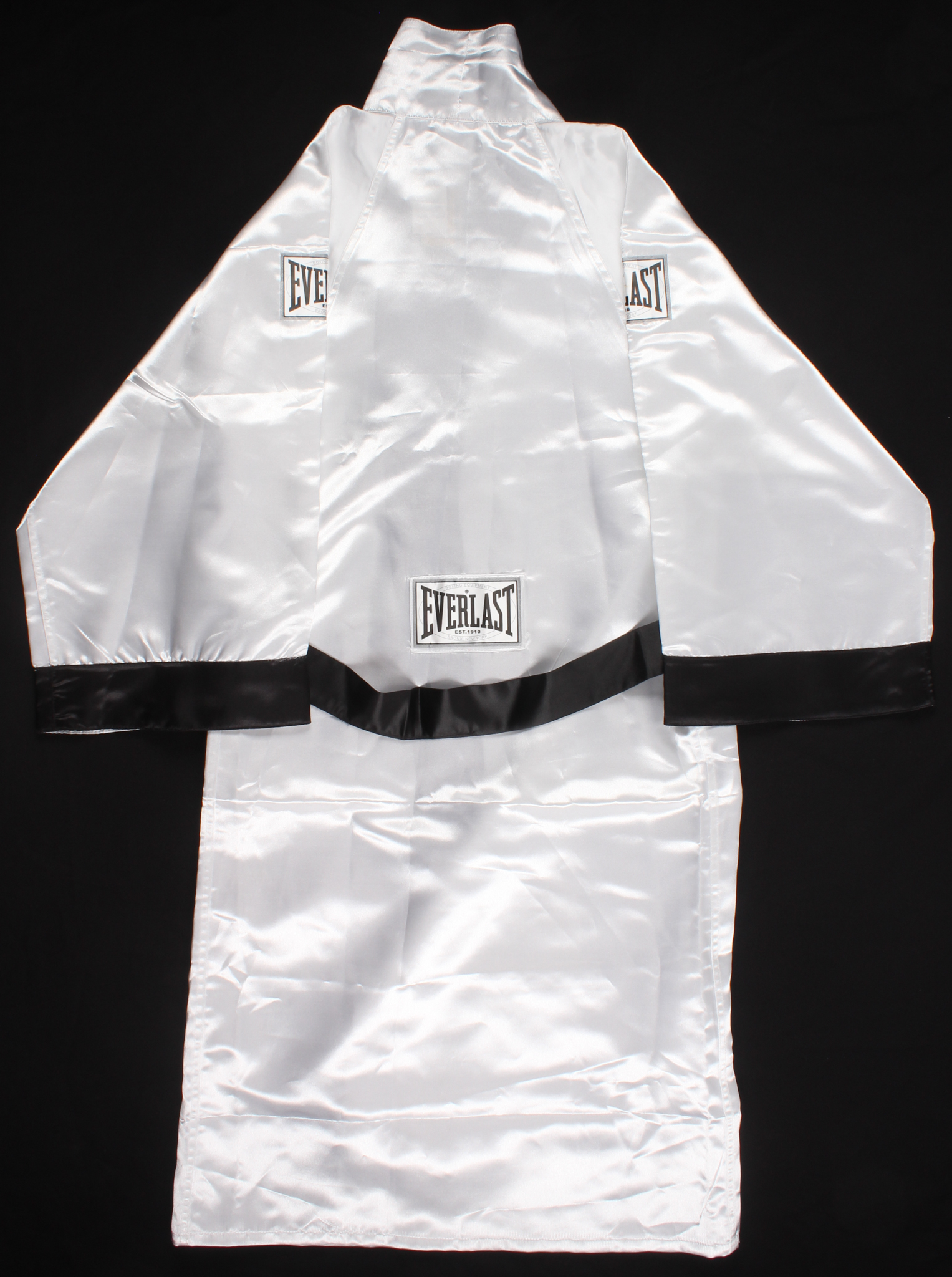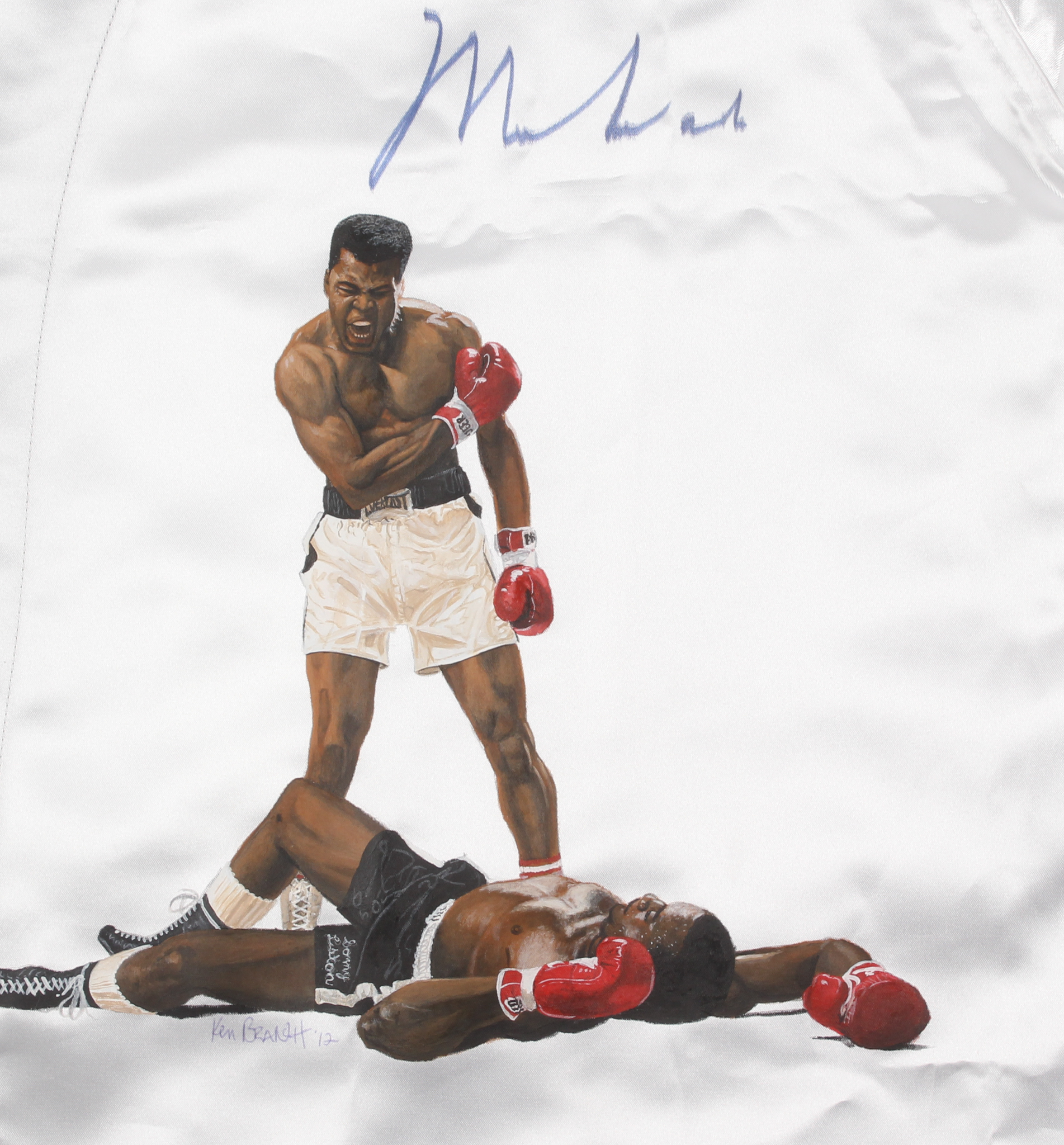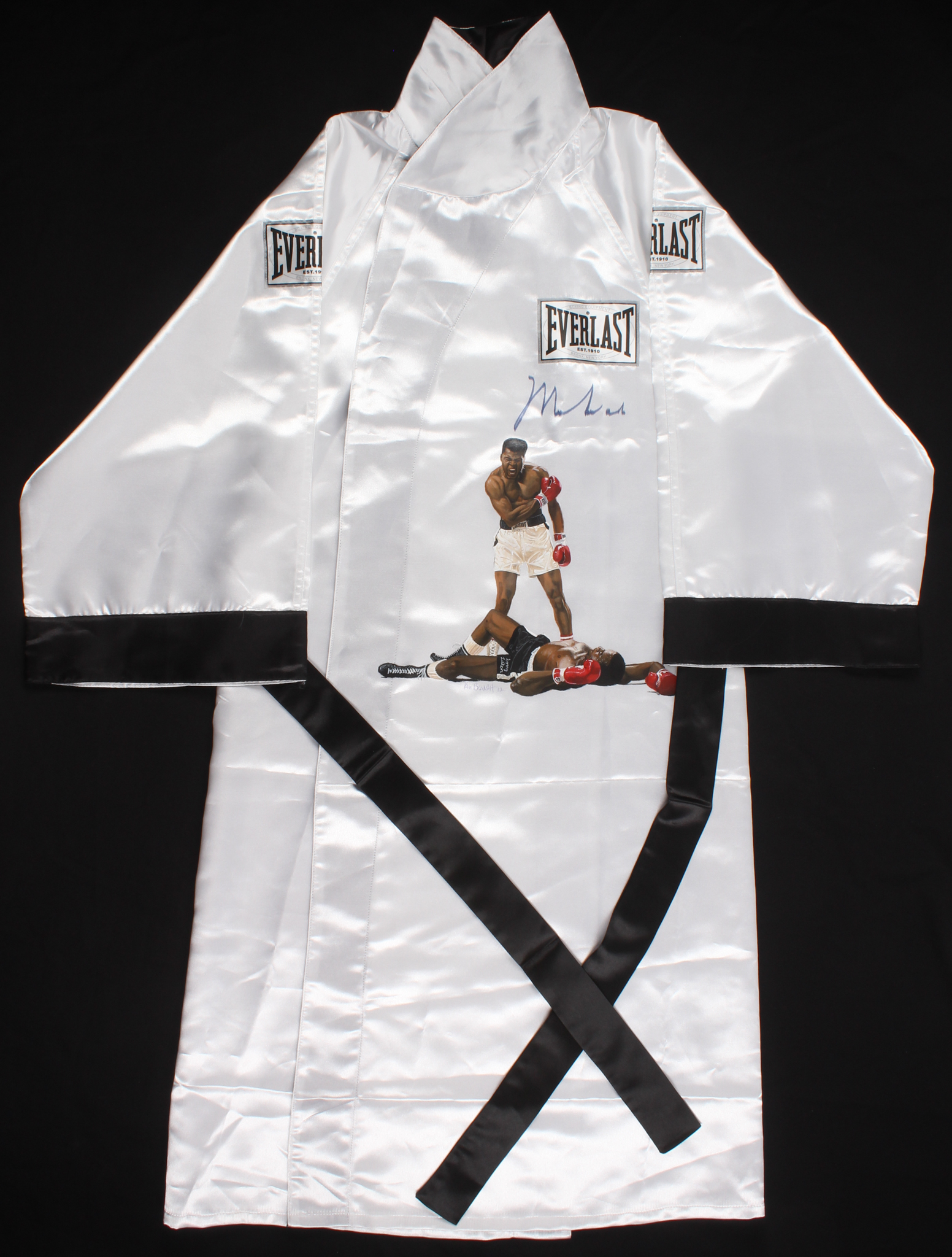 Full-size Everlast Boxing Robe hand-signed in blue felt-tip pen by Muhammad Ali (D. 2016, HOF). The robe also includes hand-painted art of Ali over Liston which is signed by the artist. One of a kind piece!