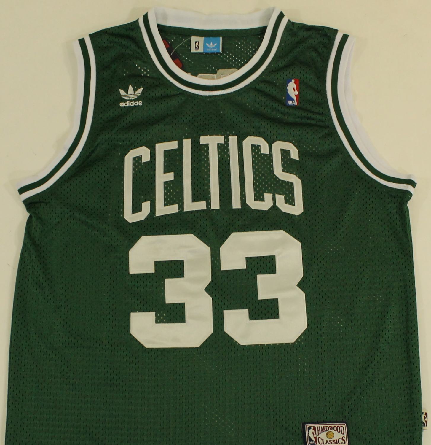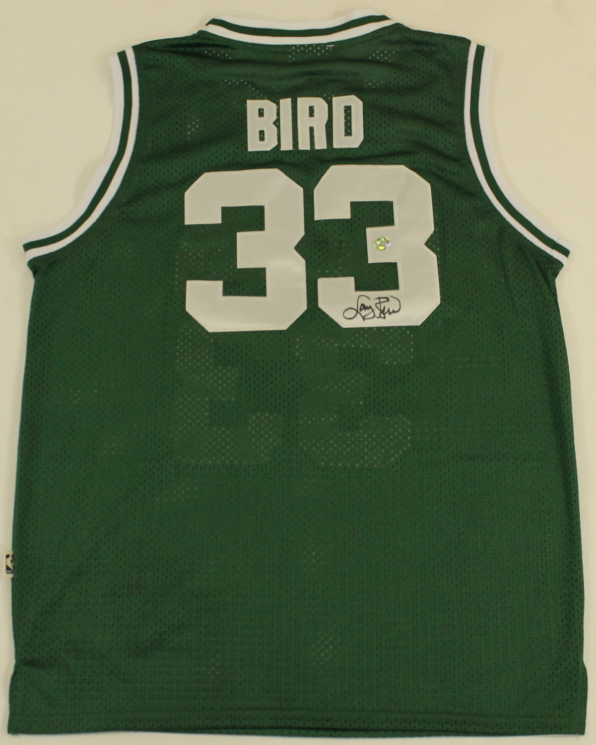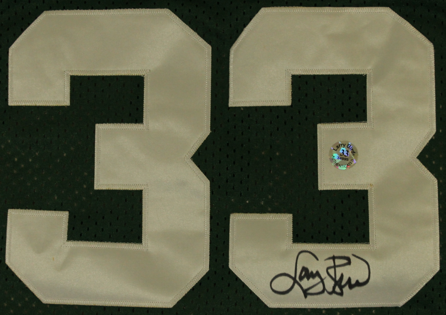 Custom on-court style jersey. Everything is sewn on, size XL. Hand-signed in black felt tip pen by Larry Bird (Celtics HOF). The autograph includes an official Larry Bird player hologram for authenticity purposes.