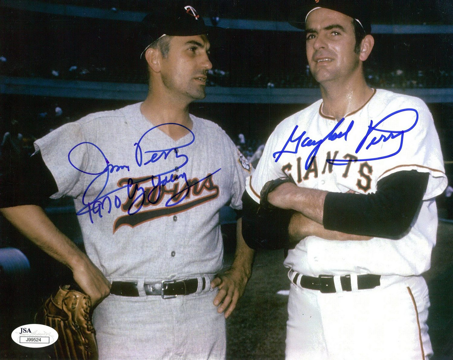 Photo measures 8" x 10" in size and has been hand-signed and inscribed in blue felt-tip pen by Jim Perry (Twins) and Gaylord Perry (Giants HOF). The autograph includes an official James Spence Authentication (JSA) hologram and matching COA for authenticity purposes.
