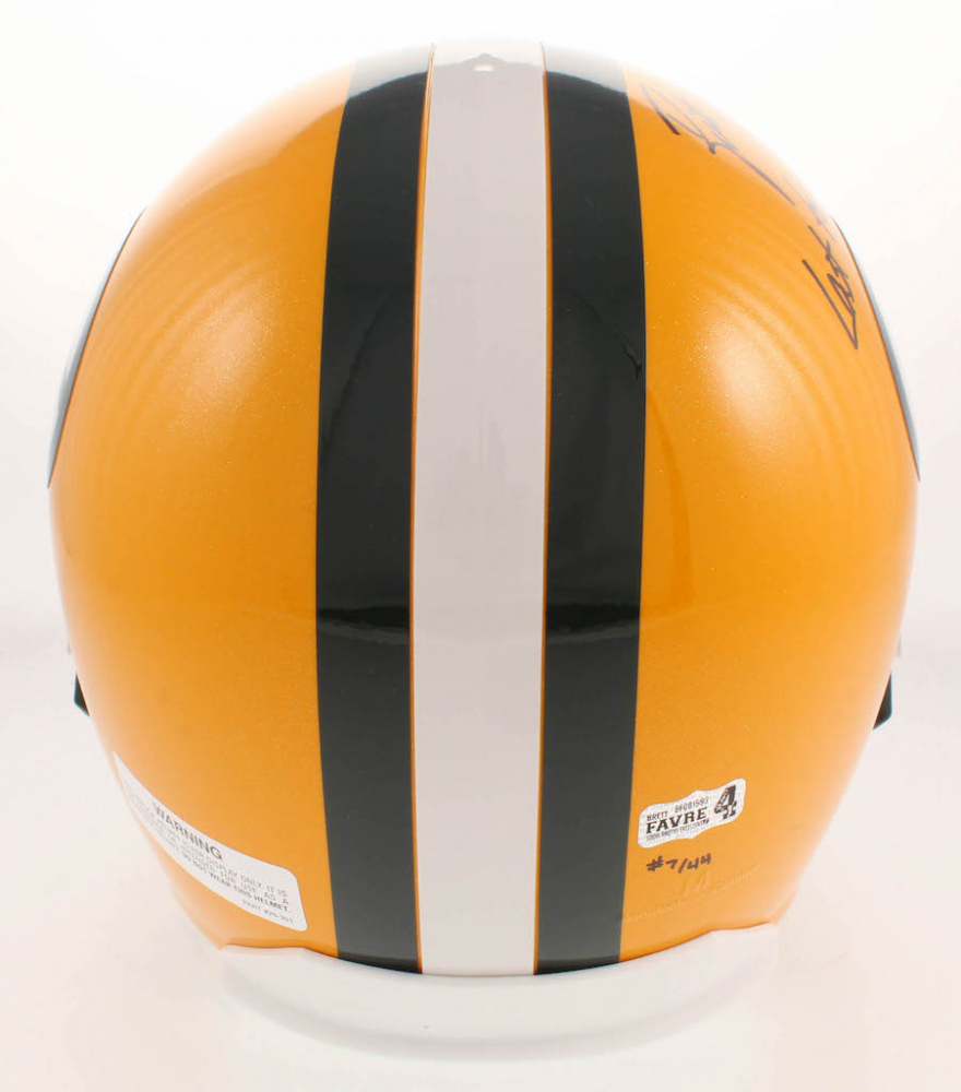 Riddell Green Bay Packers full-size replica helmet. Has been hand-signed and inscribed in black felt-tip pen by Brett Favre (HOF). Limited edition hand numbered #27 / 44. Please note, you are bidding on the edition number in the title. The images shown are stock images from the same edition run.