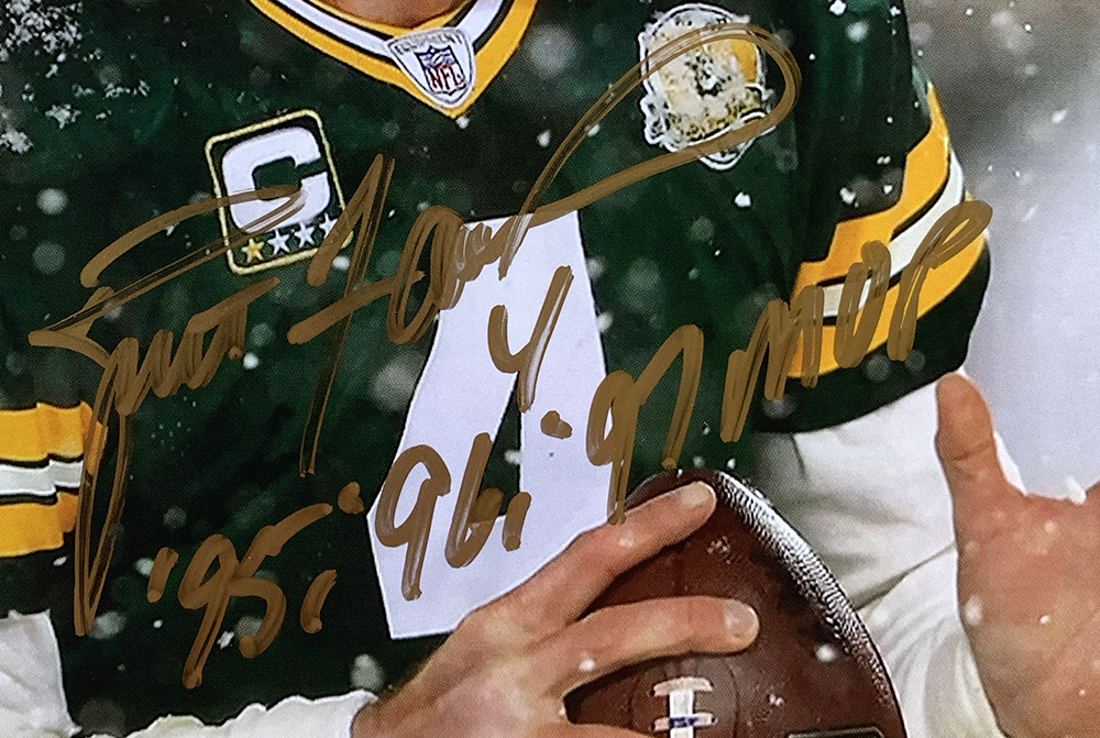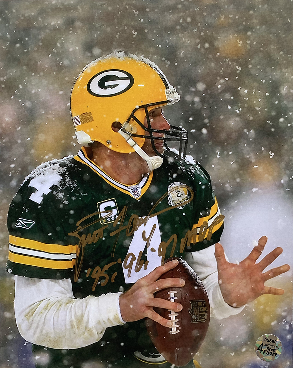 Photo measures 8" x 10" in size and has been hand-signed and inscribed in gold paint pen by Brett Favre (HOF).