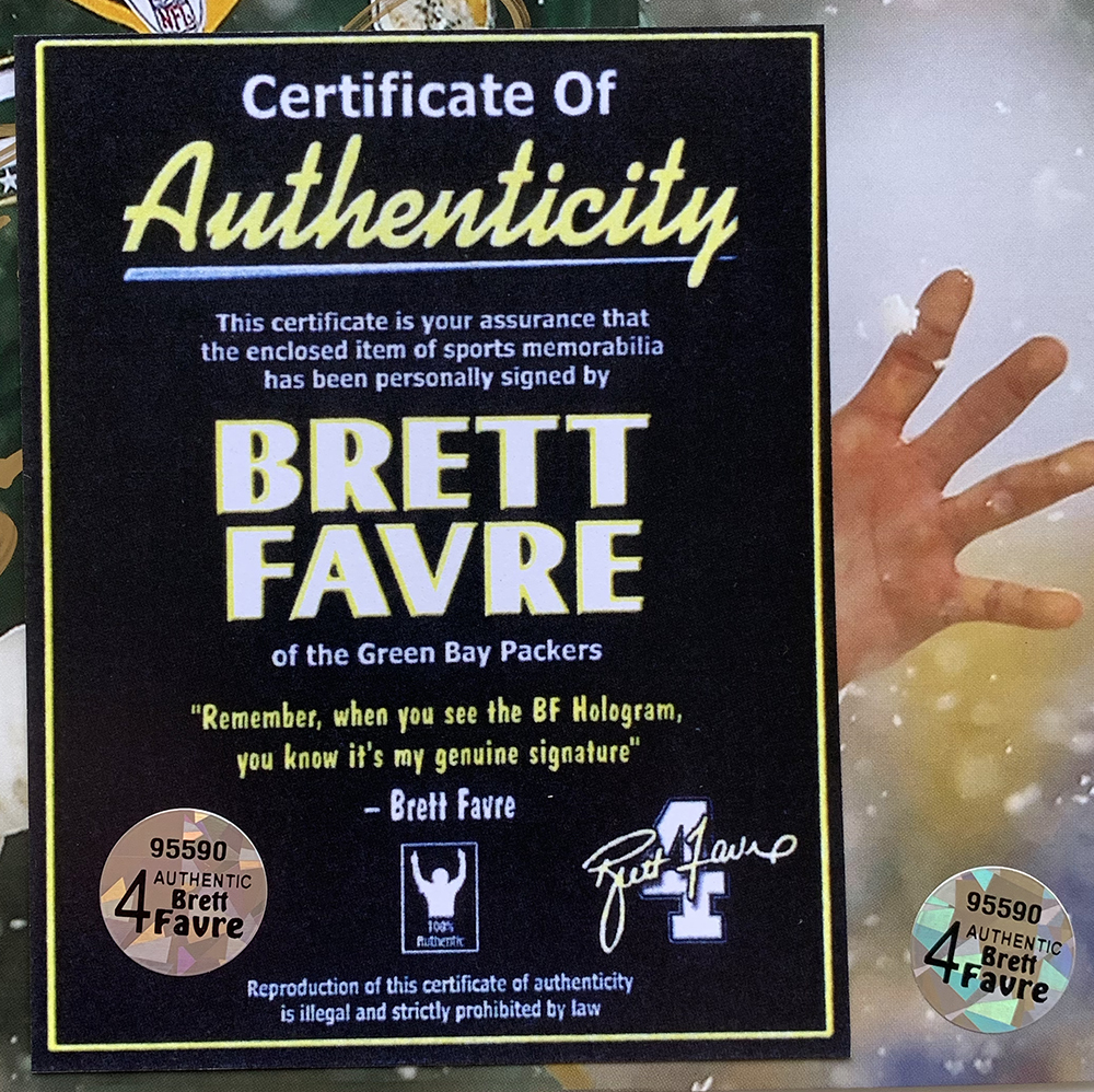 The lot / autograph(s) includes an official Brett Favre player hologram and matching COA for authenticity purposes.