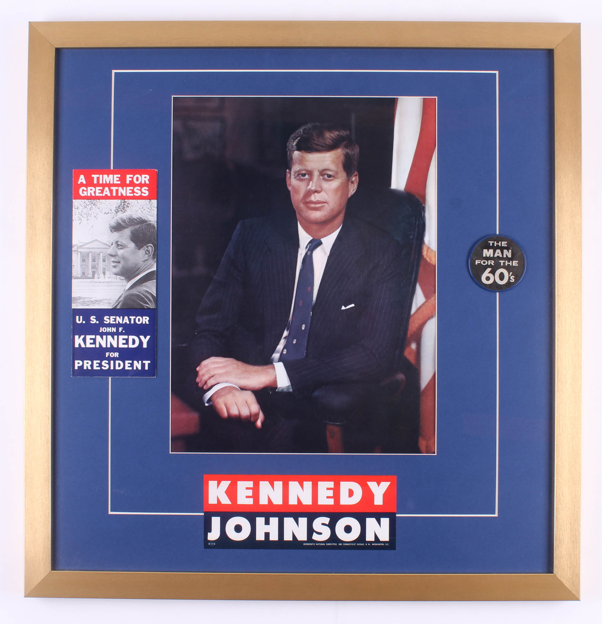 Custom frame measures 24" x 25" in size and features a photo of John F. Kennedy. The display also features a Kennedy presidential campaign bumper sticker, pamphlet and pin.