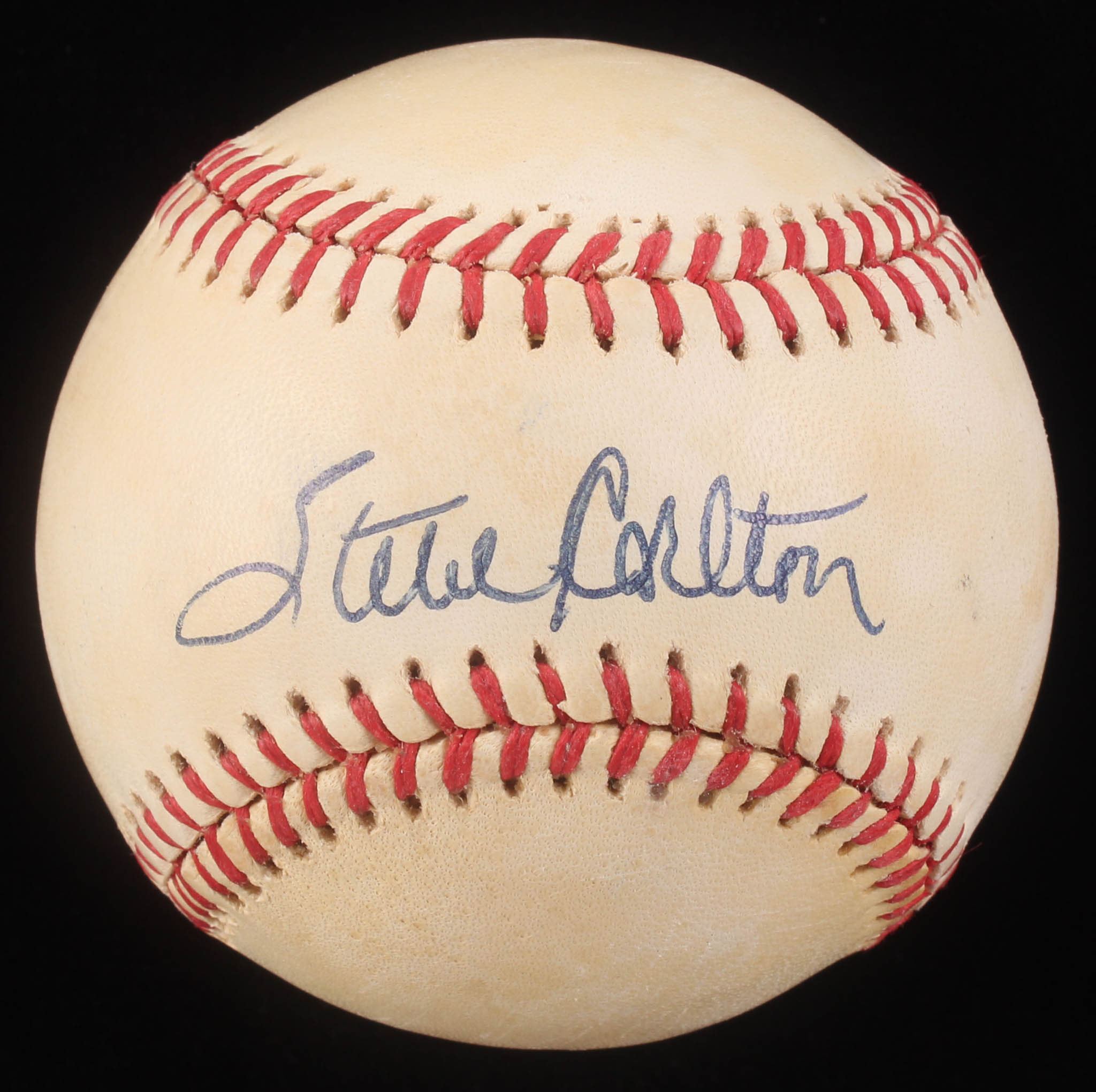 Rawlings Official National League baseball. Hand-signed in blue ink pen by Steve Carlton (Philadelphia Phillies, HOF). Please note, the baseball shows natural signs of toning.