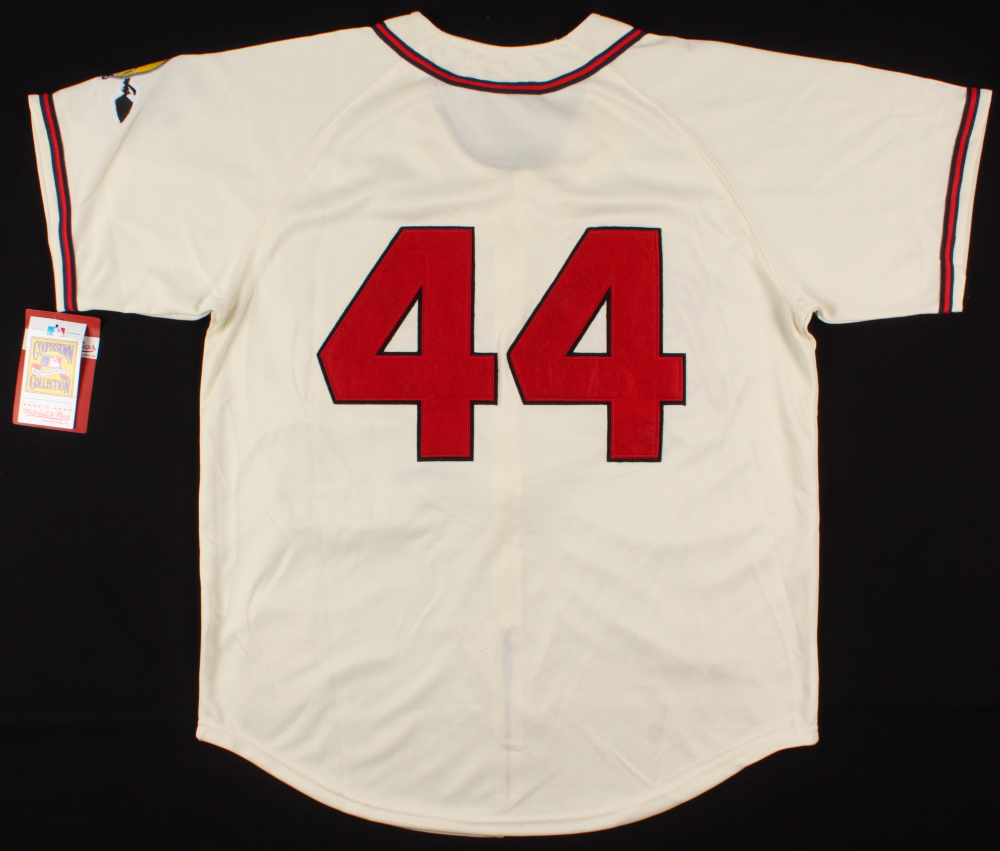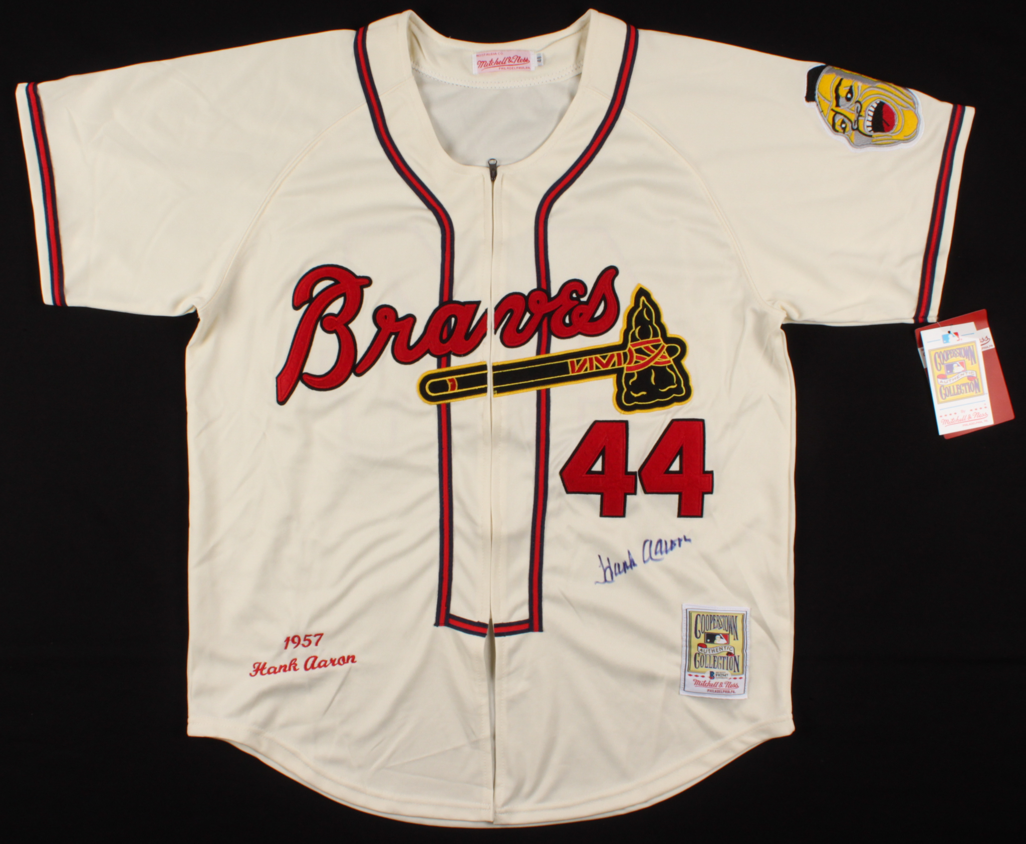 Mitchell & Ness on-field style jersey. Everything is sewn on, size 48. Hand-signed and inscribed in black felt-tip pen by Hank Aaron (HOF).