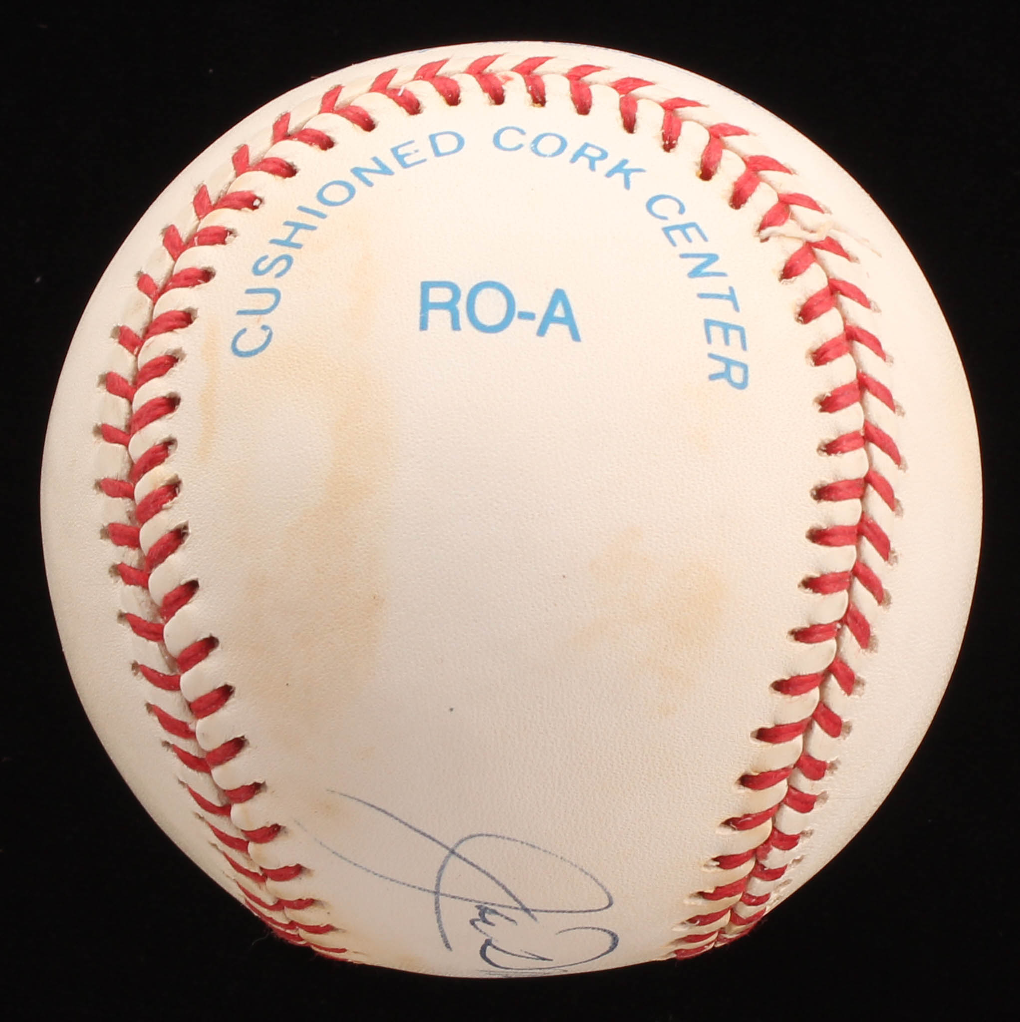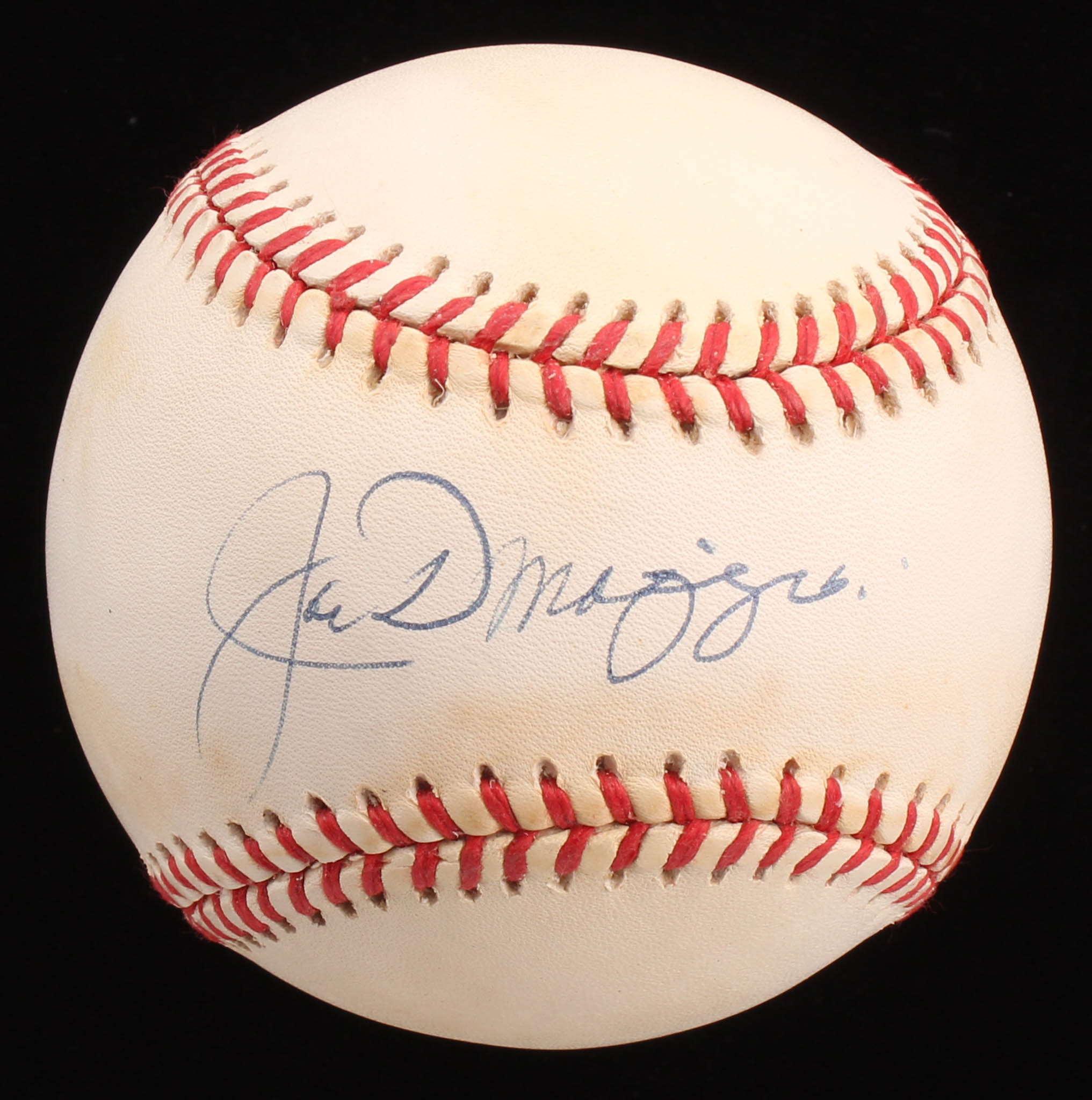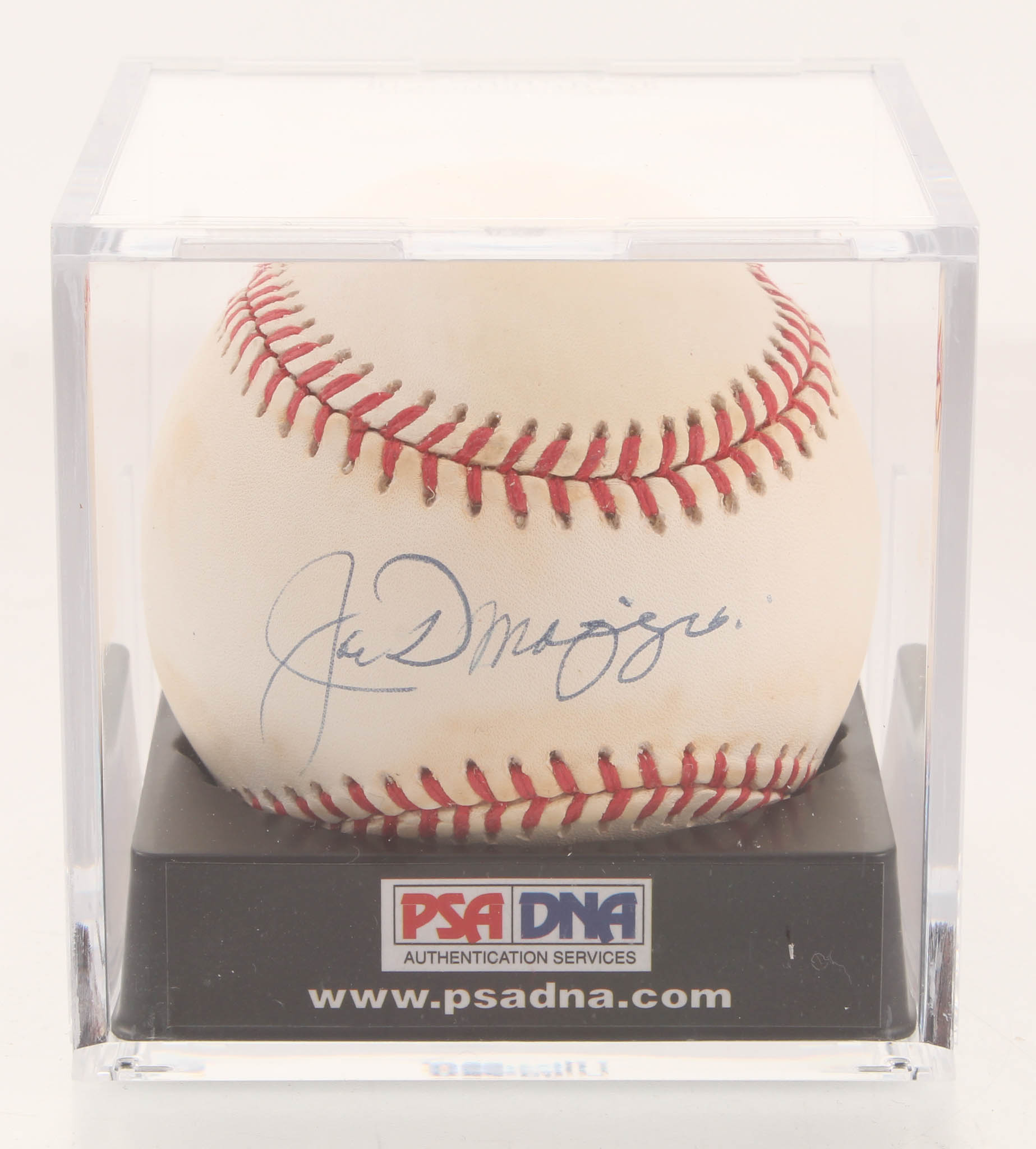 Rawlings Official American League baseball. Hand-signed in blue ink pen by Joe DiMaggio (D. 1999, New York Yankees, HOF). Please note, the baseball shows signs of natural toning. Includes the display case shown.