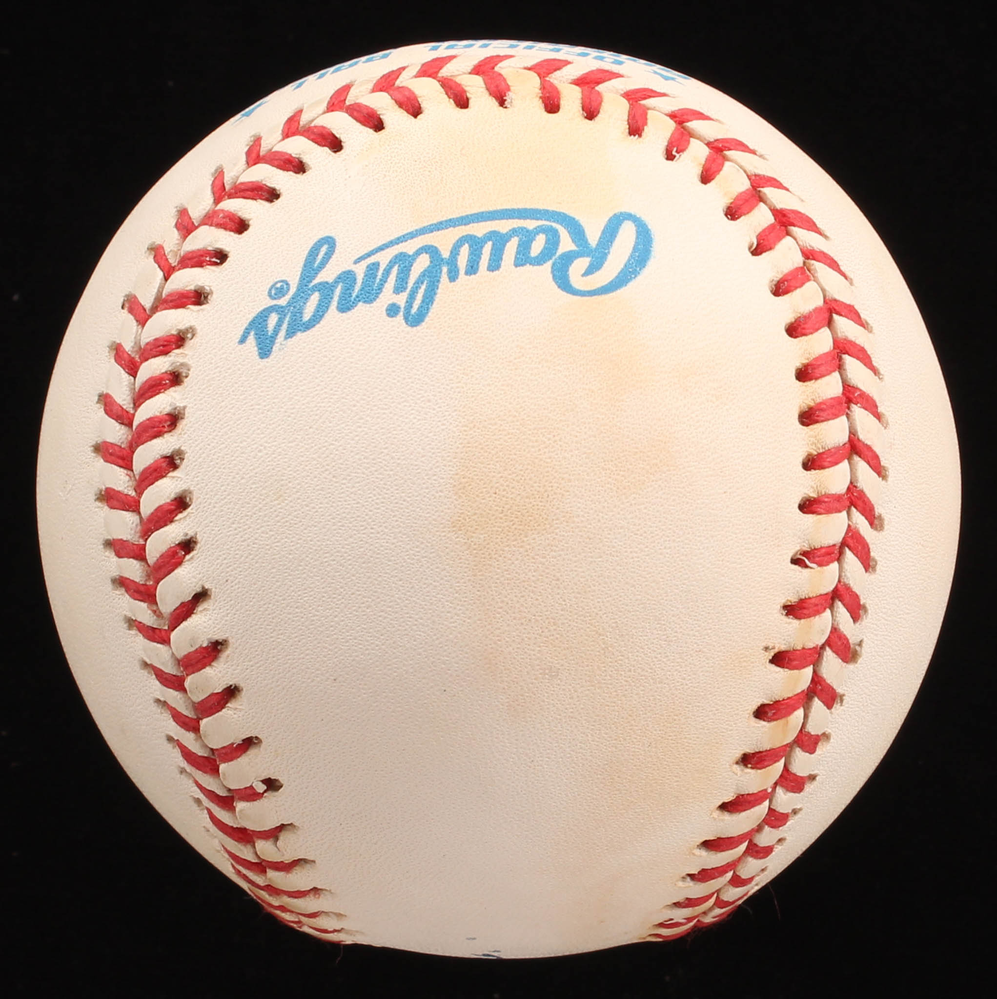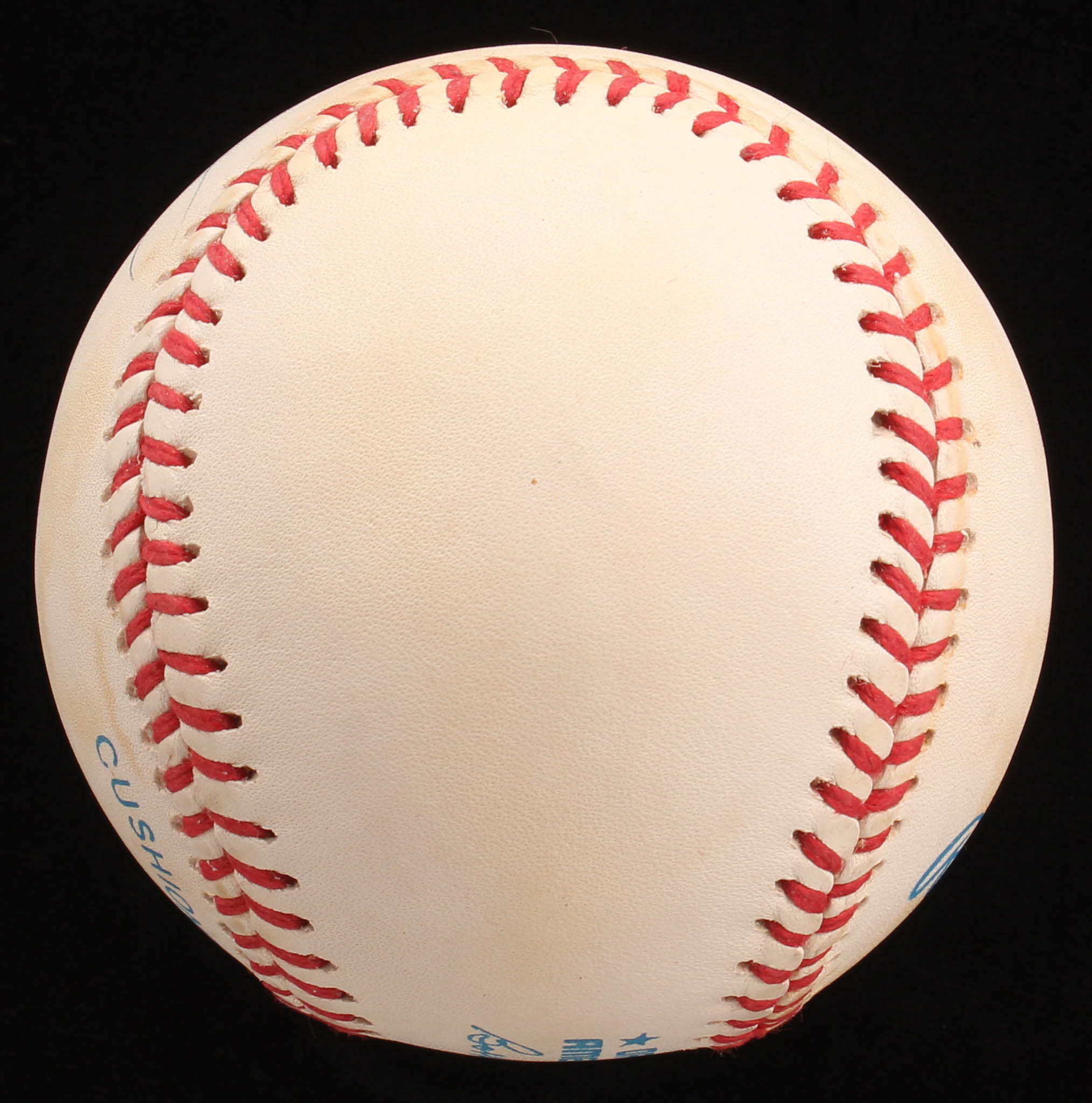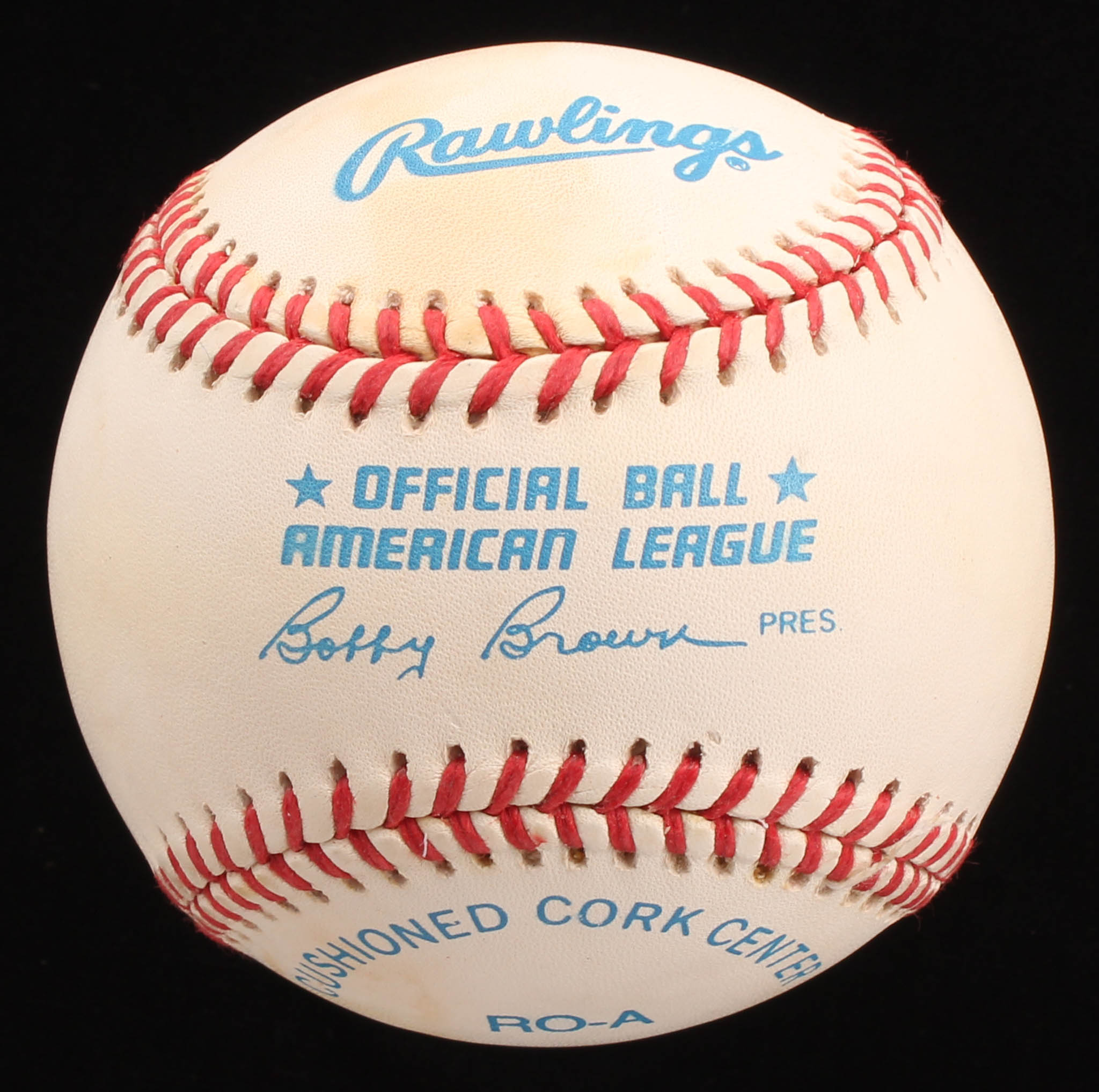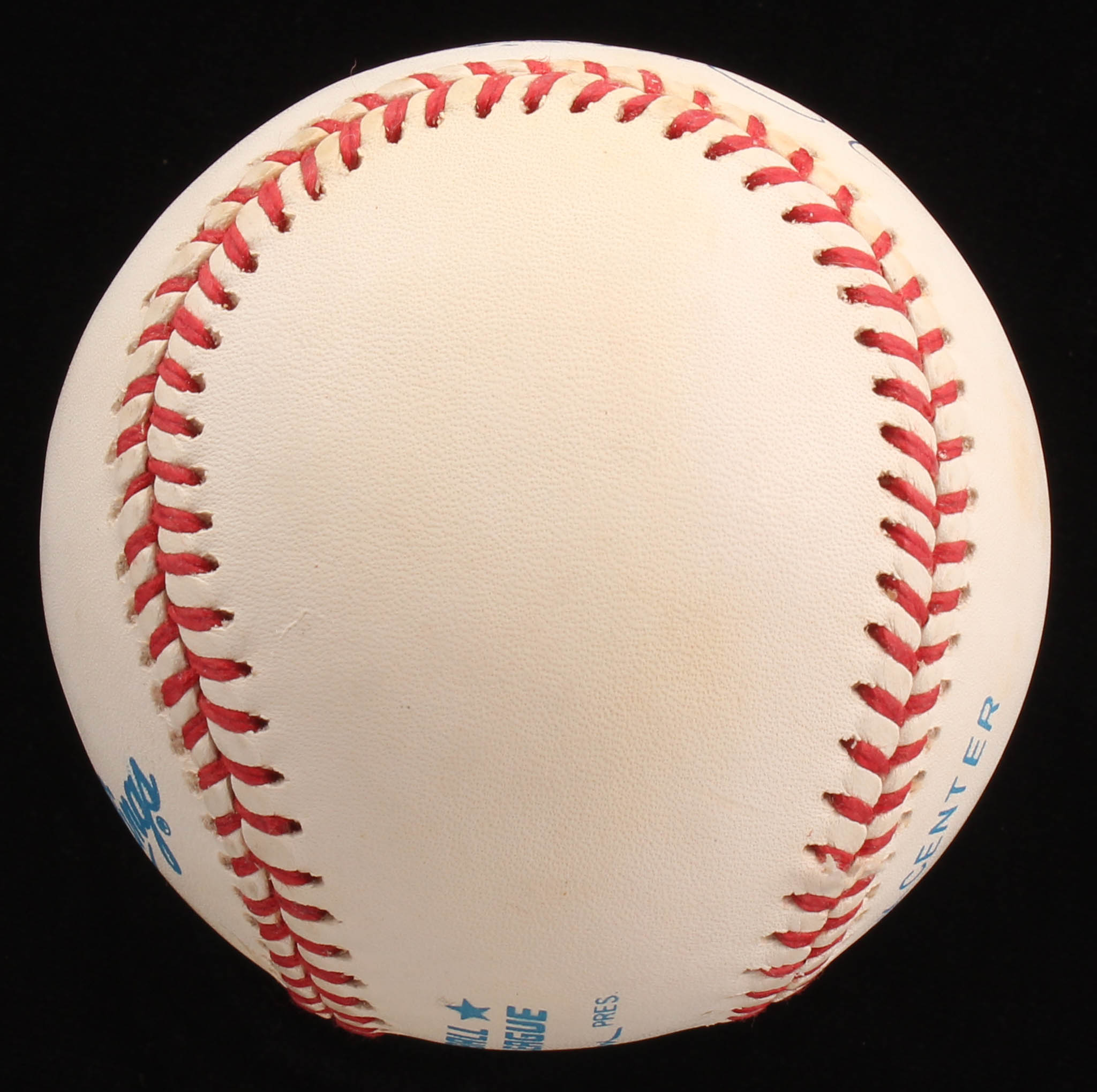 Rawlings Official American League baseball. Hand-signed in blue ink pen by Joe DiMaggio (D. 1999, New York Yankees, HOF). Please note, the baseball shows signs of natural toning. Includes the display case shown.