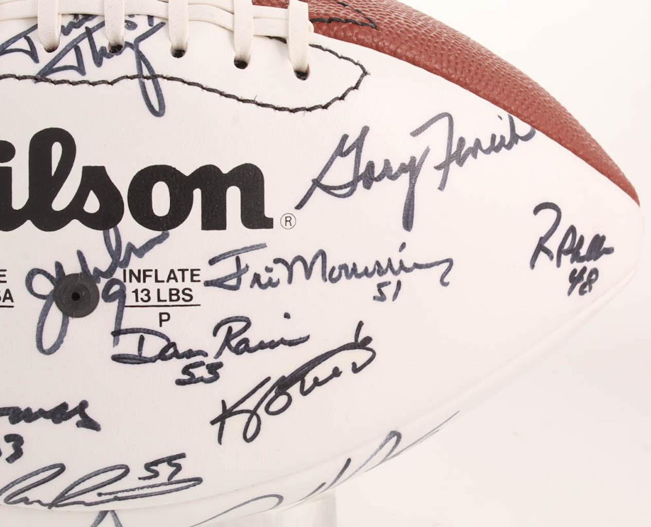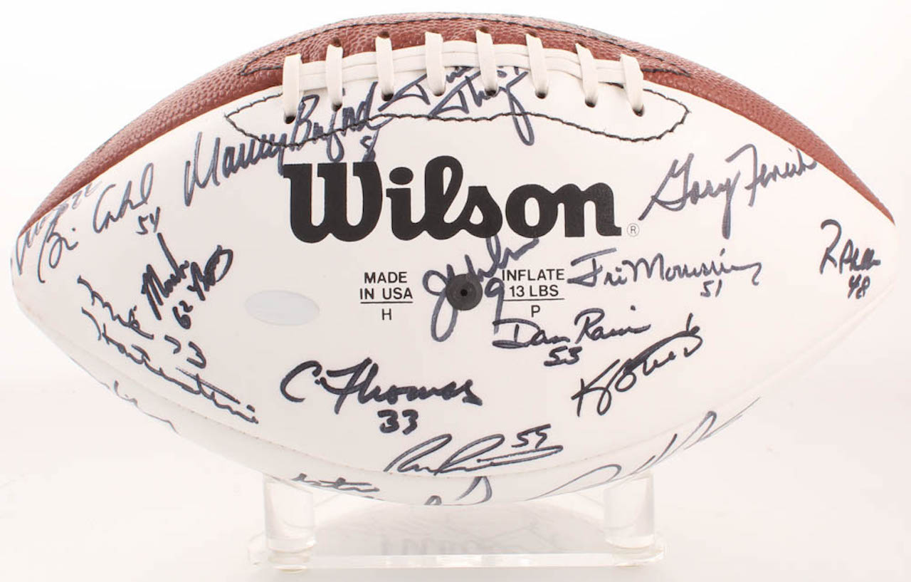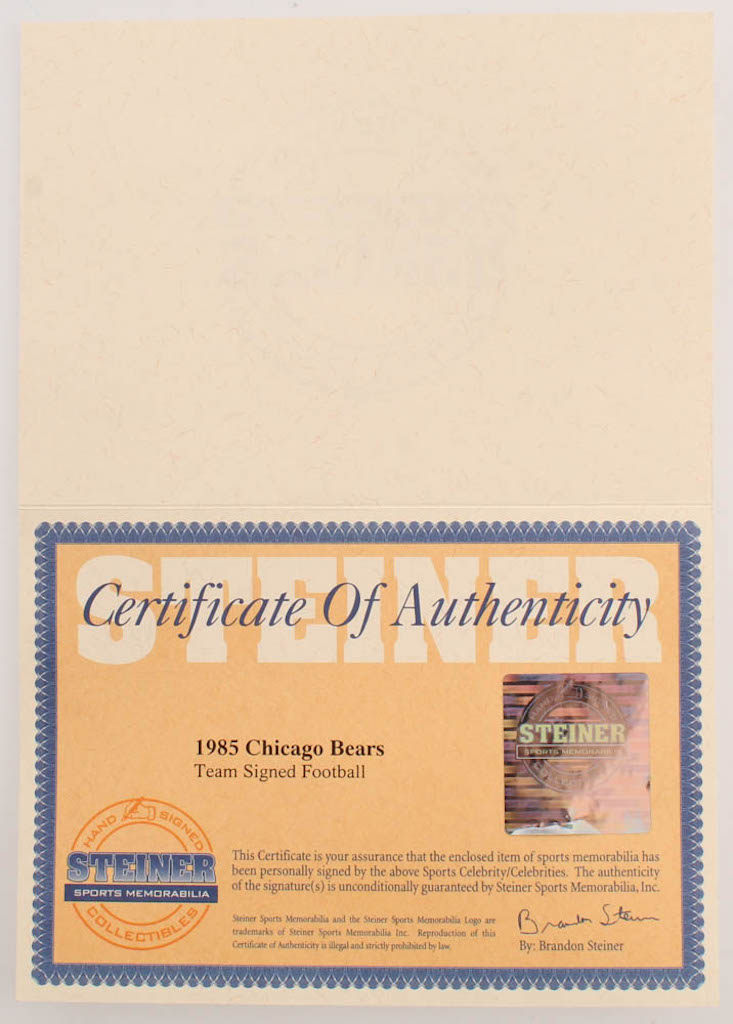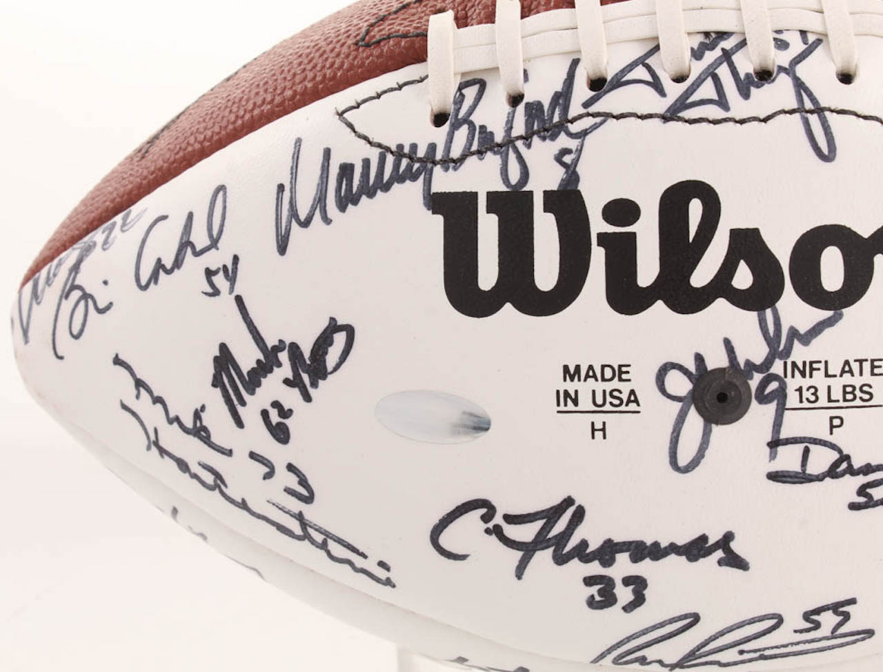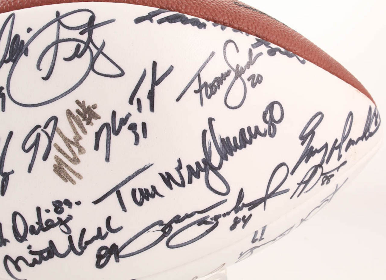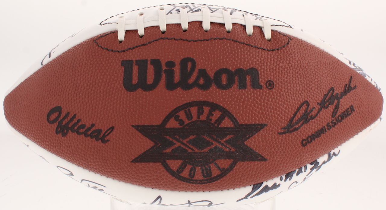 Wilson Official Super Bowl XX Football. Hand-signed in black felt-tip pen by With Mike Singletary, Walter Payton, Dan Hampton, Jim McMahon, Dave Duerson, Brian Cabral, Mike Hartenstine, Mark Bortz, Maury Buford, Tom Thayer, Calvin Thomas, Ron Rivera, Dan Rains, Kevin Butler, Jim Morrissey, Reggie Phillips, Gary Fencik, Kurt Becker, Jim Covert, Steve McMichael, Shaun Gayle, Keith Van Horne, Henry Waechter, Steve Fuller, Andy Frederick, Cliff Thrift, Tom Andrews, Tyrone Keys, Dennis Gentry, Keith Ortego, Mitch Krenk, Ken Taylor, Brian Baschnagel, Tim Wrightman, Thomas Sanders, Pat Dunsmore, James Maness, Leslie Fraier, and 4 others.