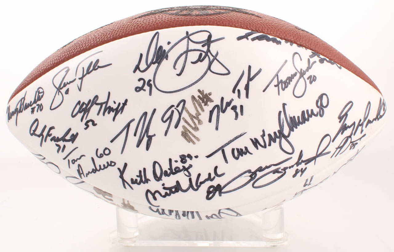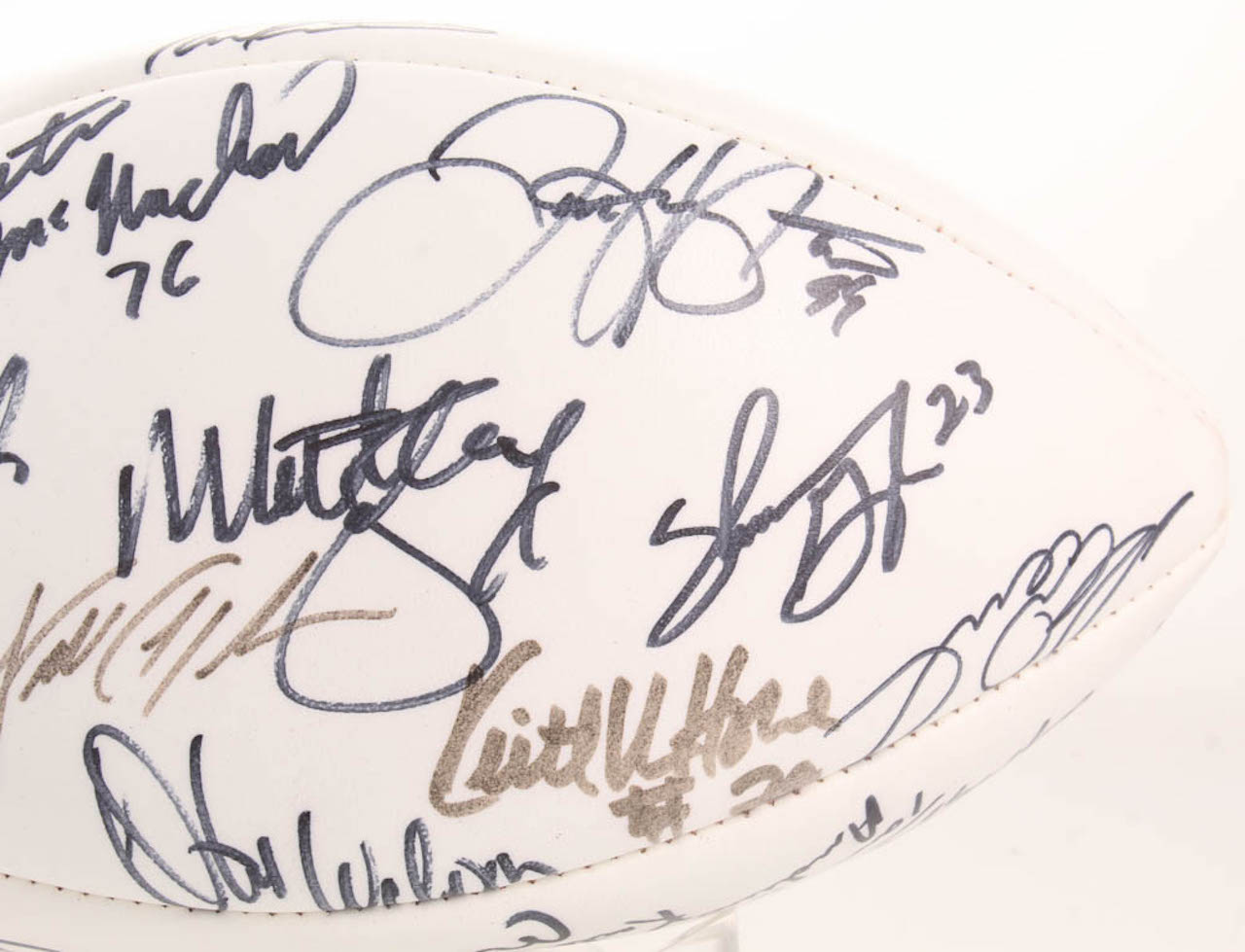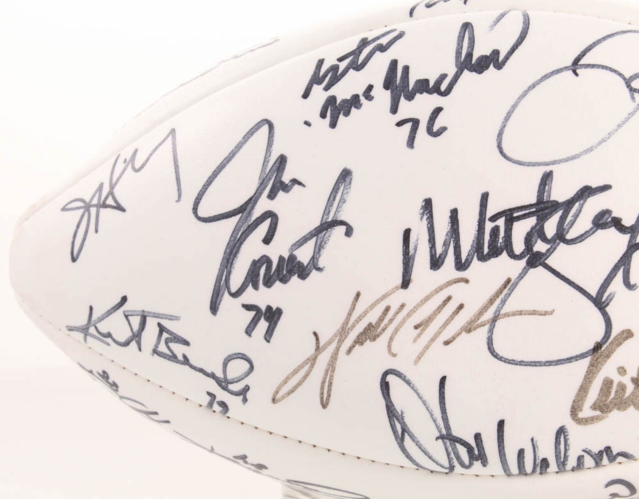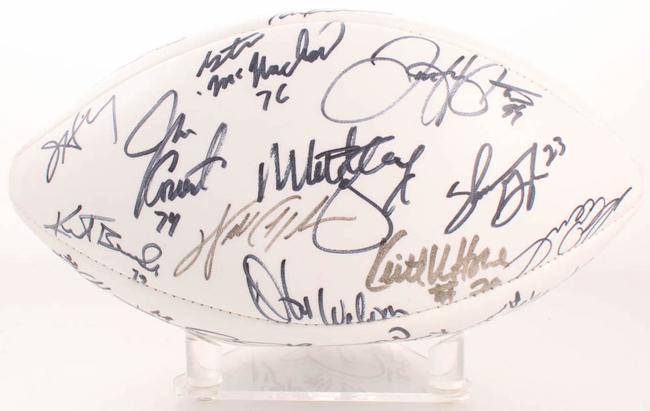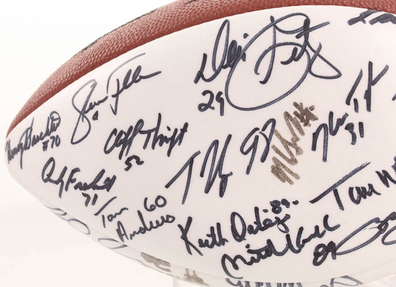 Wilson Official Super Bowl XX Football. Hand-signed in black felt-tip pen by With Mike Singletary, Walter Payton, Dan Hampton, Jim McMahon, Dave Duerson, Brian Cabral, Mike Hartenstine, Mark Bortz, Maury Buford, Tom Thayer, Calvin Thomas, Ron Rivera, Dan Rains, Kevin Butler, Jim Morrissey, Reggie Phillips, Gary Fencik, Kurt Becker, Jim Covert, Steve McMichael, Shaun Gayle, Keith Van Horne, Henry Waechter, Steve Fuller, Andy Frederick, Cliff Thrift, Tom Andrews, Tyrone Keys, Dennis Gentry, Keith Ortego, Mitch Krenk, Ken Taylor, Brian Baschnagel, Tim Wrightman, Thomas Sanders, Pat Dunsmore, James Maness, Leslie Fraier, and 4 others.