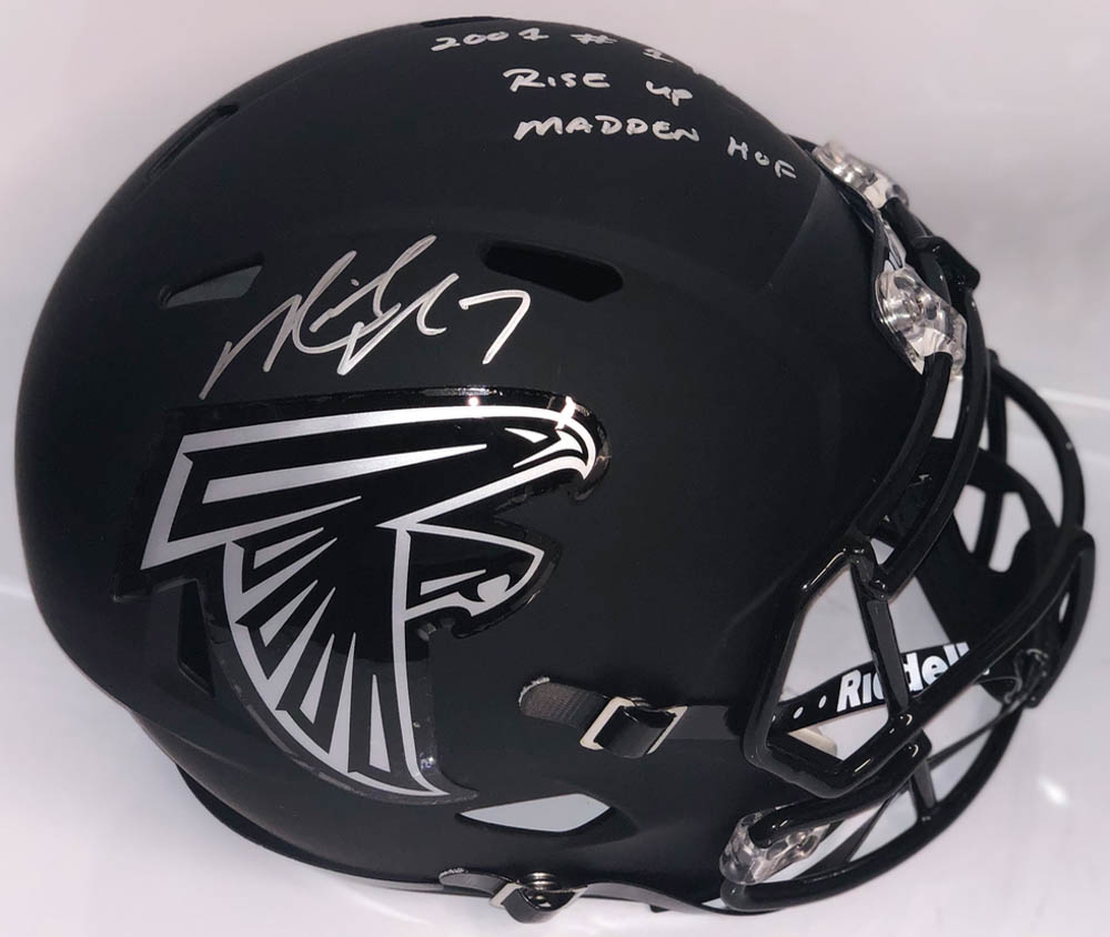 Atlanta Falcons full-size replica speed helmet. Hand-signed and inscribed in silver paint pen by Michael Vick. Please note, the helmet has a small scratch near the inscriptions.