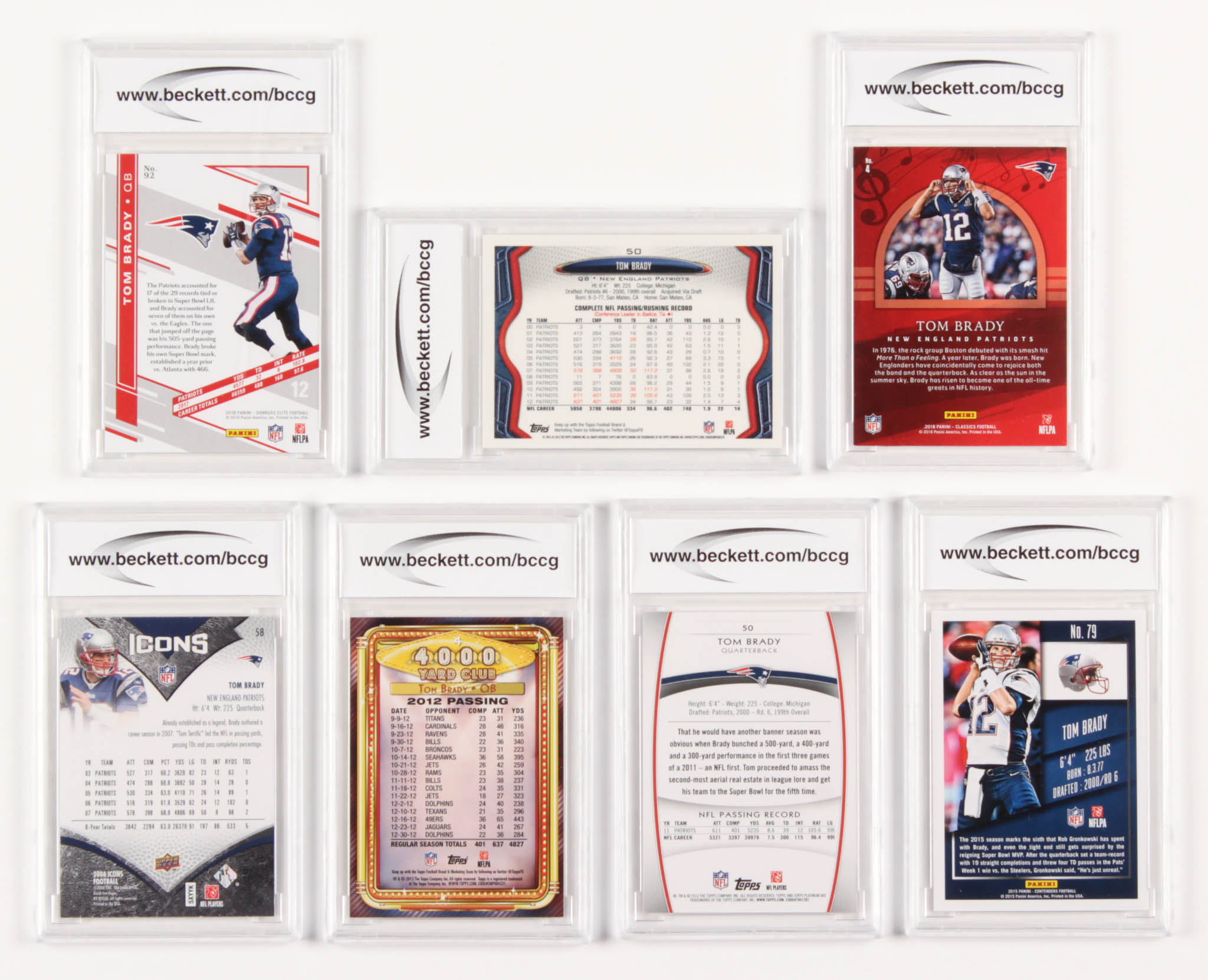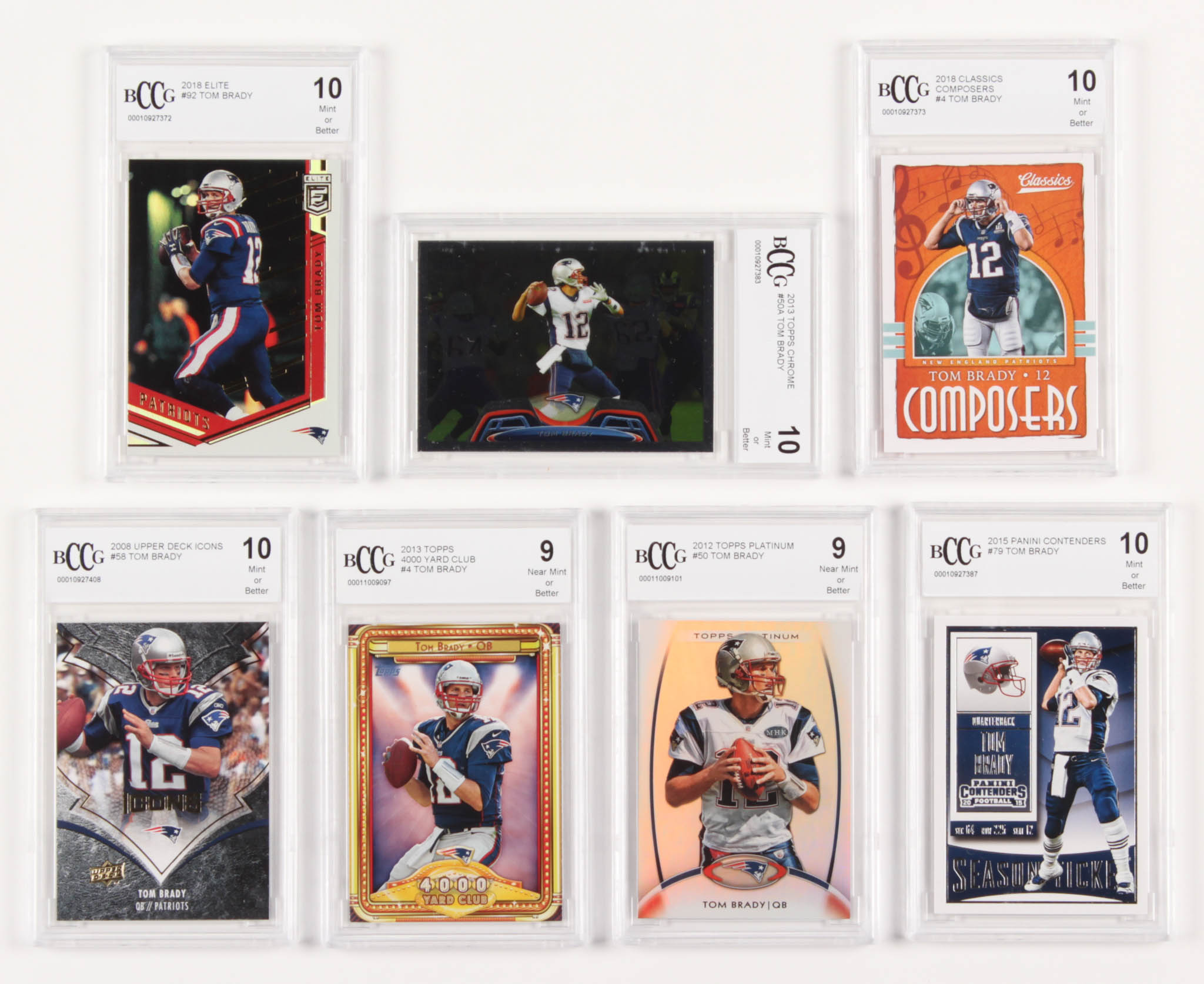 Lot of (7) Graded Tom Brady Football Cards with 2012 Topps Platinum #50 (BCCG 9), 2008 Upper Deck Icons #58 (BCCG 10), 2018 Elite #92 (BCCG 10)