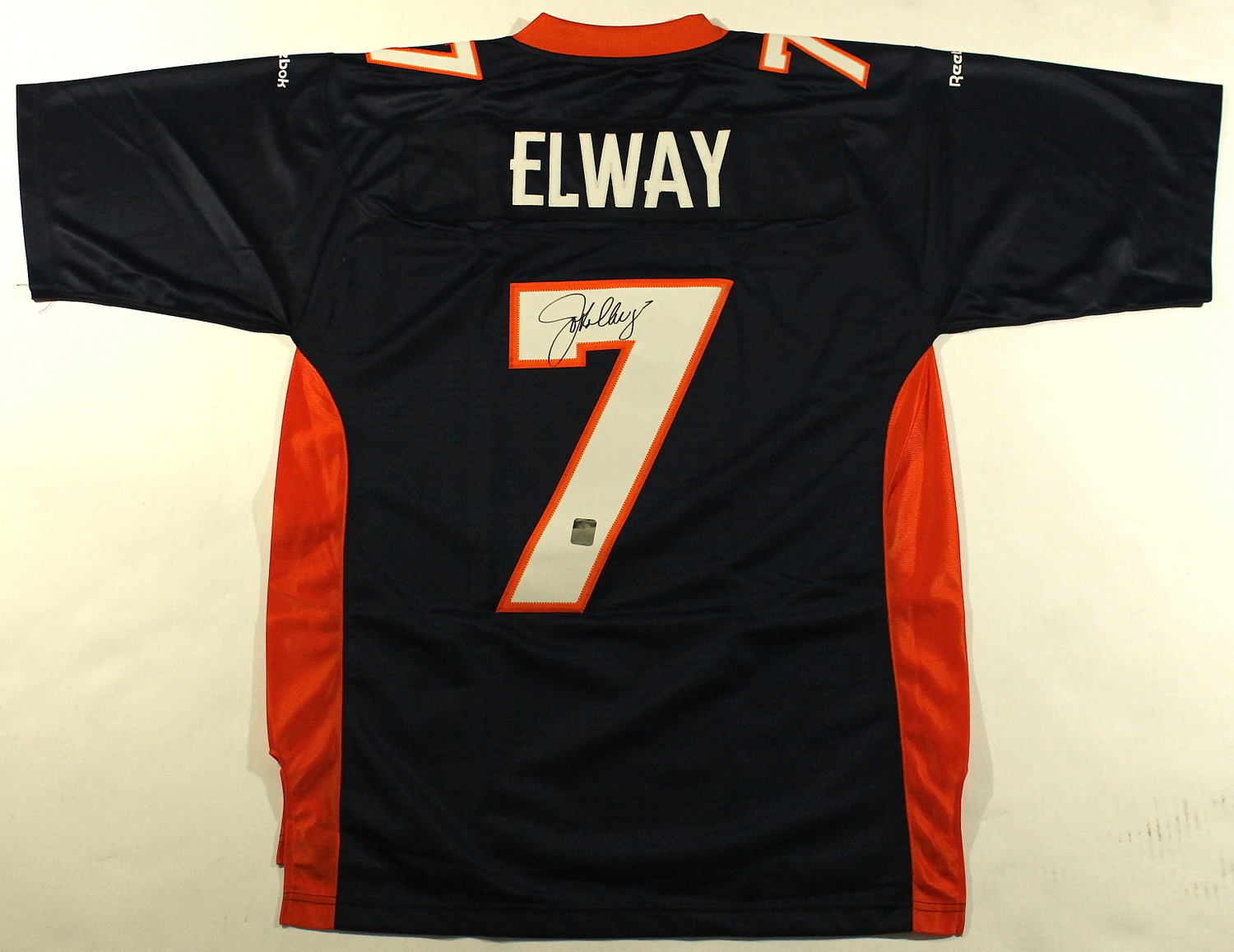 Reebok on-field style jersey. Everything is sewn on, size M. Hand-signed in black felt tip pen by John Elway (Broncos HOF). The autograph includes an official John Elway Player hologram for authenticity purposes.