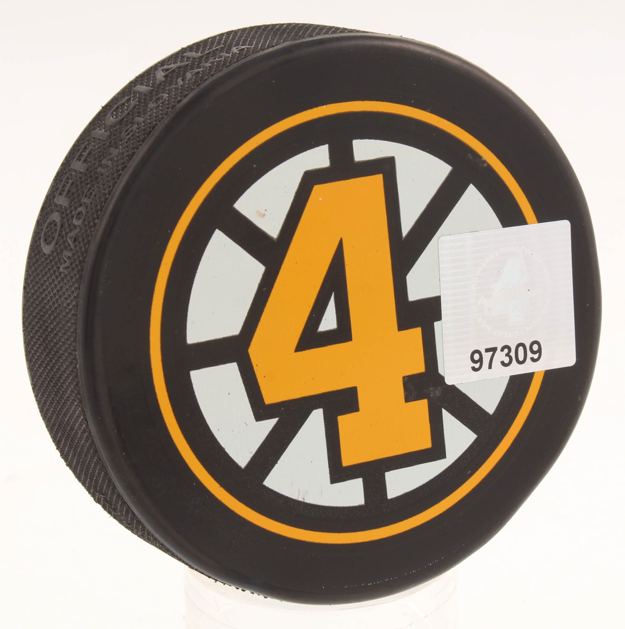 Boston Bruins Logo Hockey Puck. Puck has been hand-signed in silver paint pen by Bobby Orr (HOF).