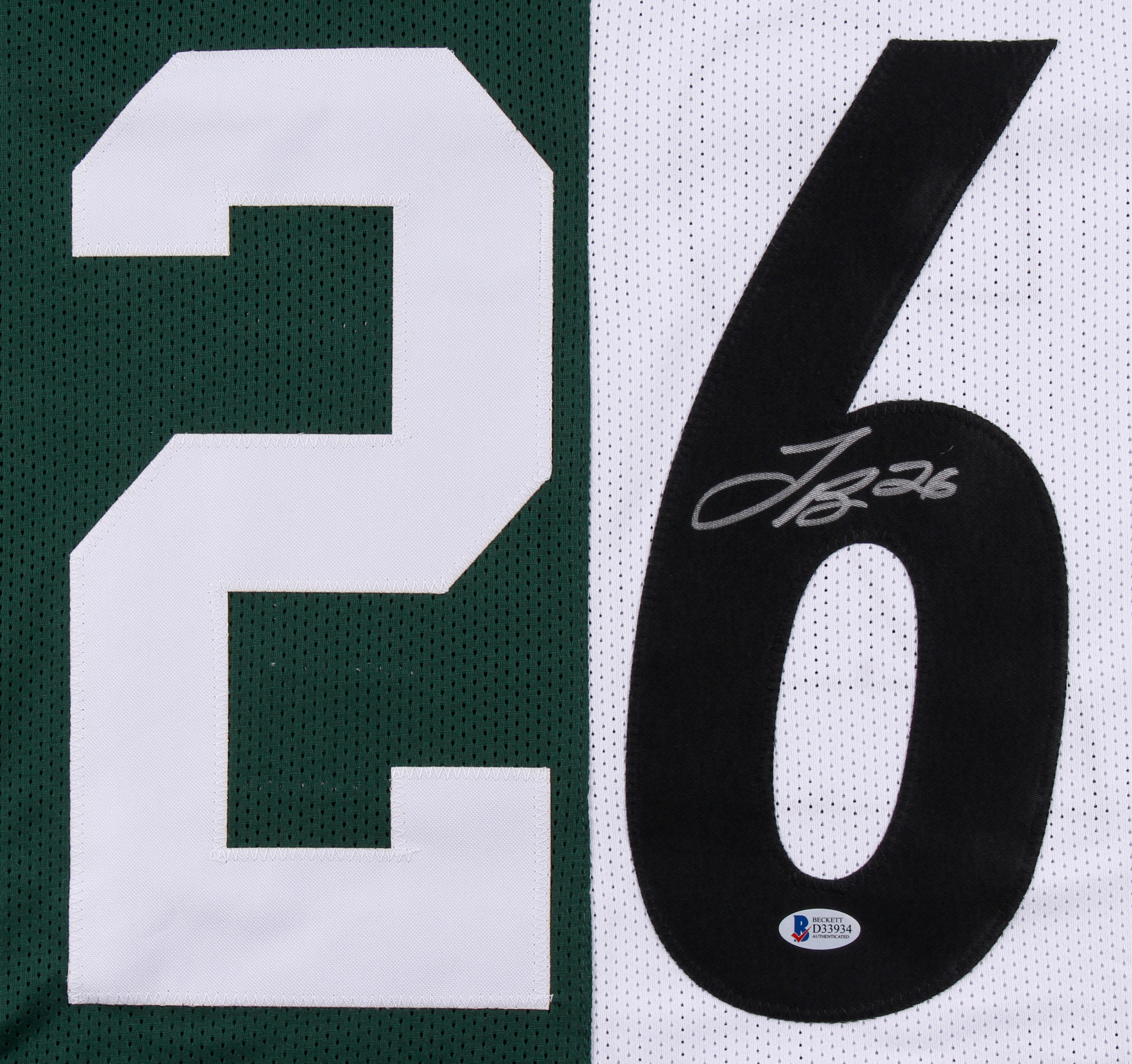 Custom on-field style jersey. Everything is sewn on, size XL. Hand-signed in silver paint pen by Le'Veon Bell.