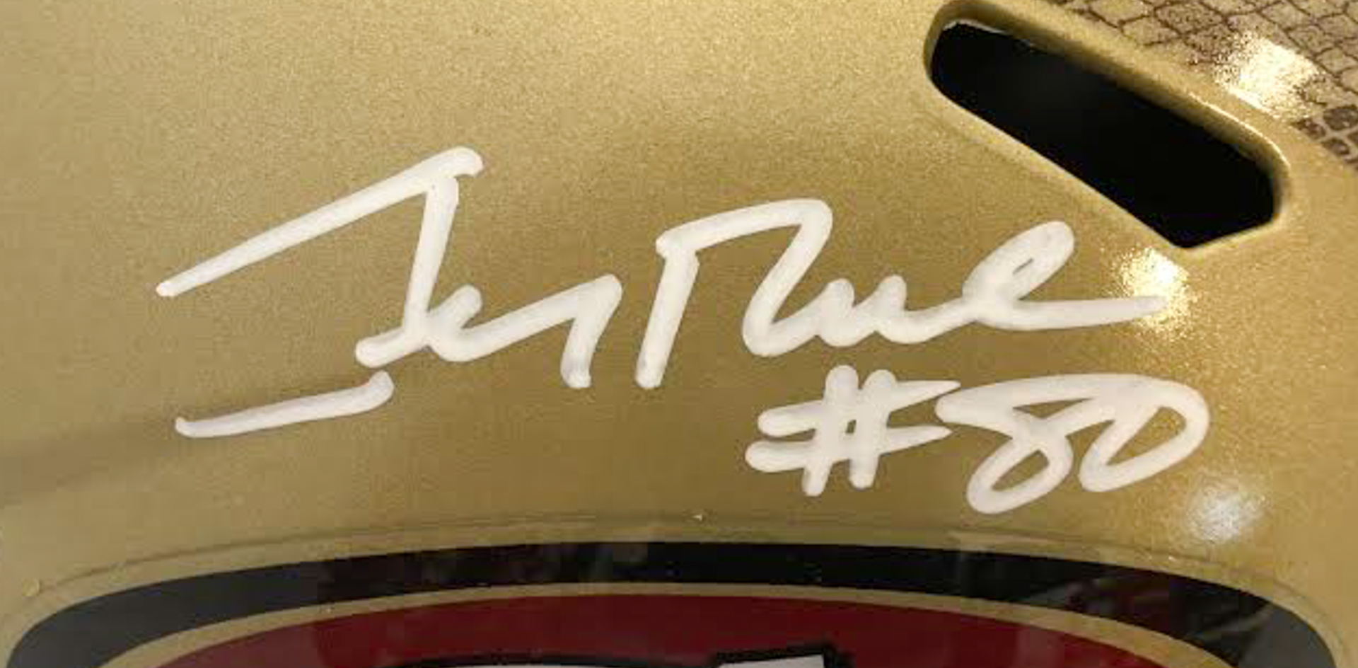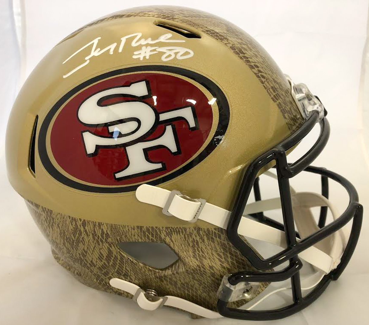Riddell San Francisco 49ers Full-Size Replica Hydro Dipped Speed Helmet. Hand-signed in white paint pen by Jerry Rice (HOF).