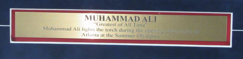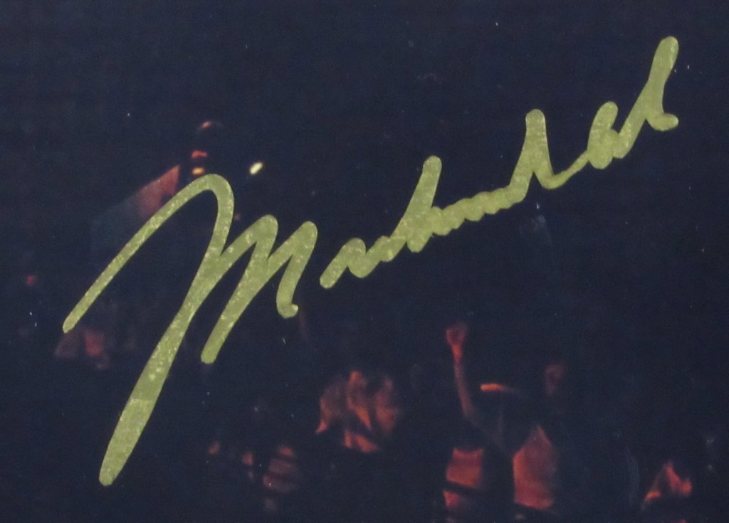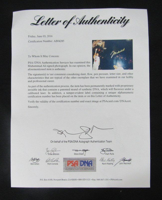 Custom frame measures 22" x 26" in size and features a photo that has been hand-signed in gold paint pen by Muhammad Ali (D. 2016, HOF).