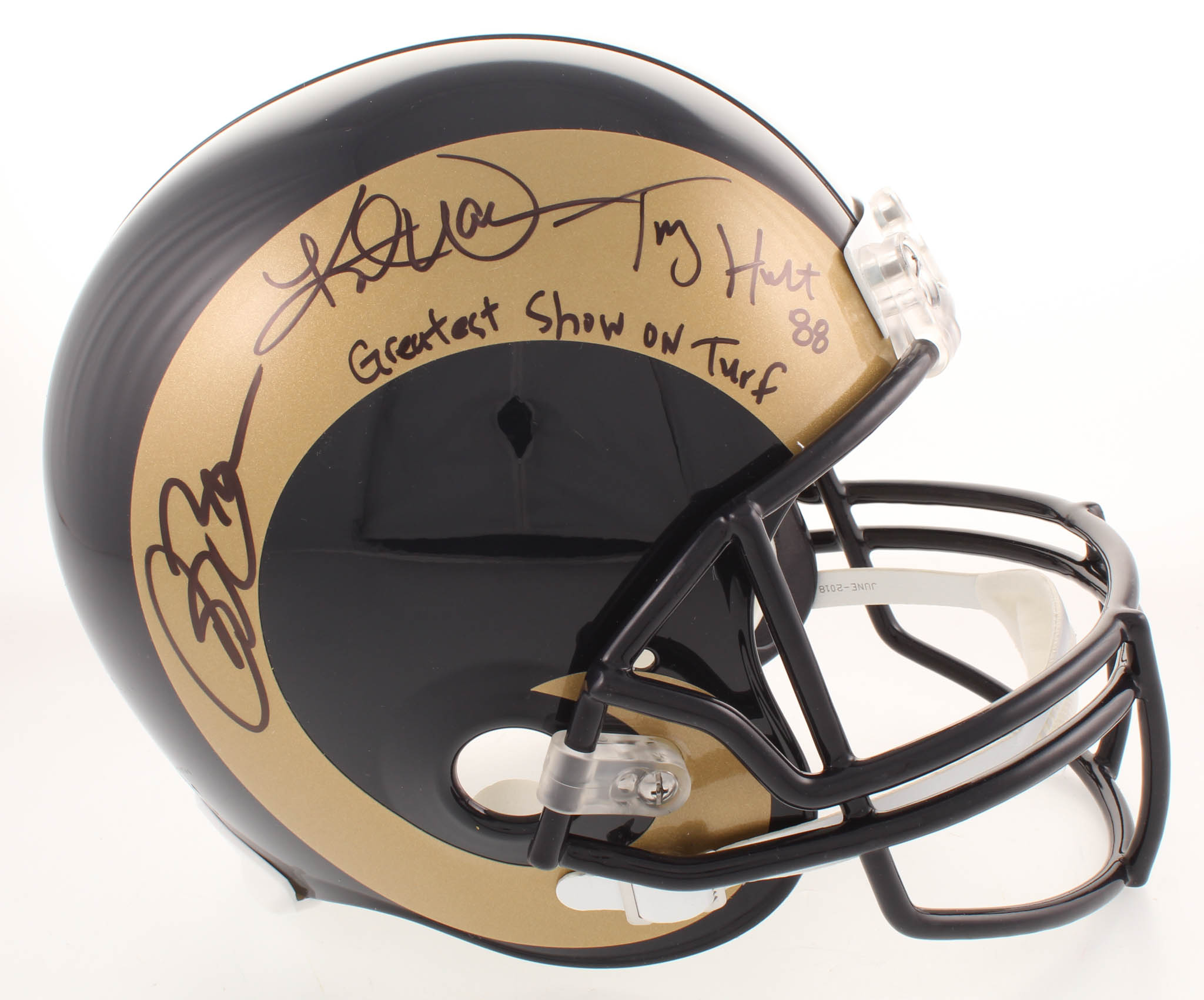 Kurt Warner, Torry Holt, & Isaac Bruce Signed St. Louis Rams Full-Size Helmet Inscribed "Greatest Show of Turf" (Beckett COA)