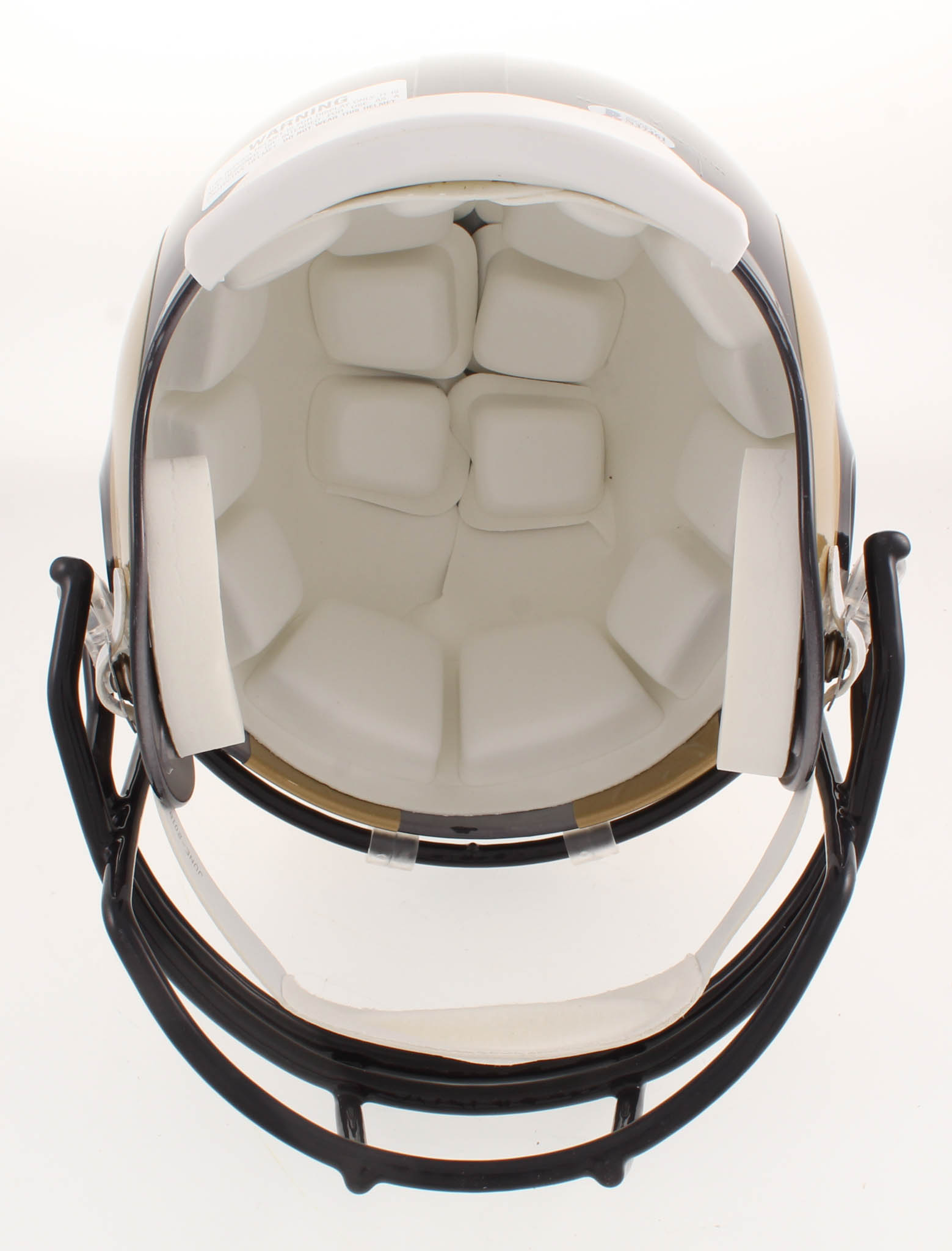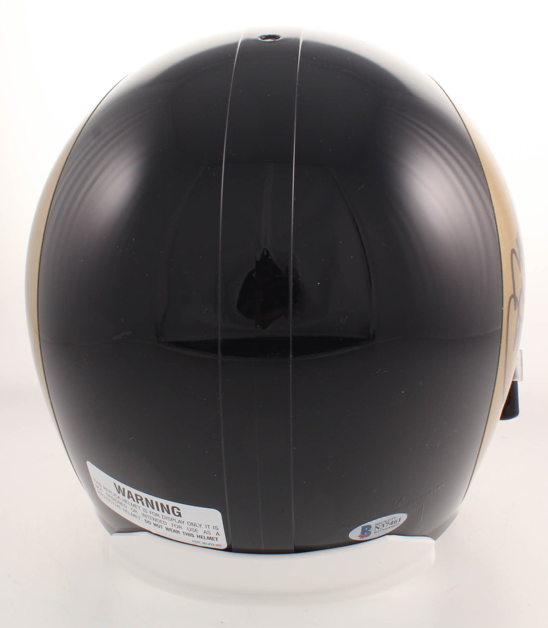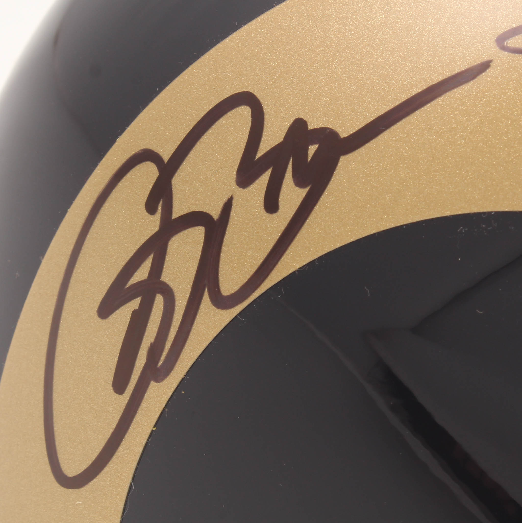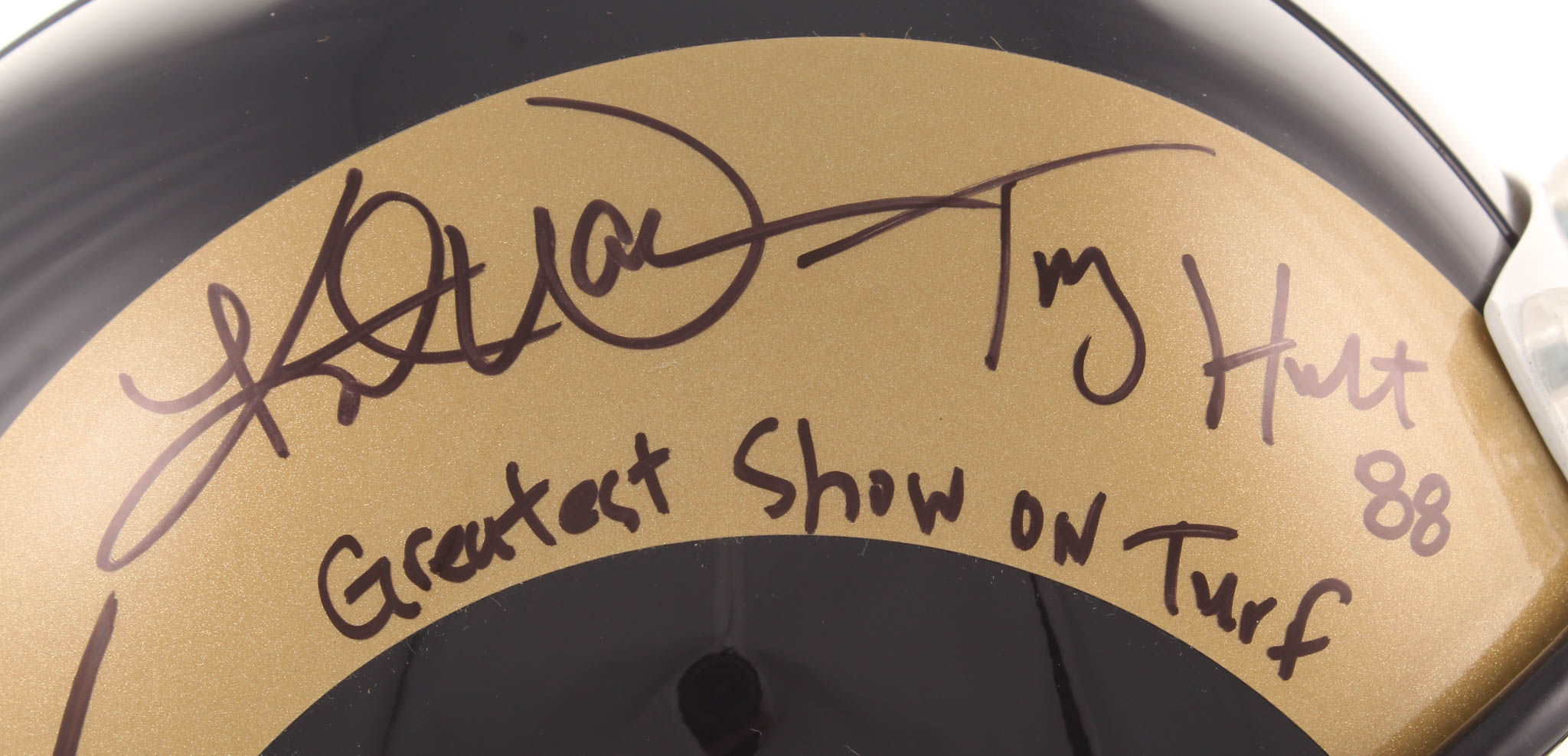 St. Louis Rams full-size replica helmet. Hand-signed and inscribed in black felt-tip pen by Kurt Warner (HOF), Torry Holt, and Isaac Bruce.