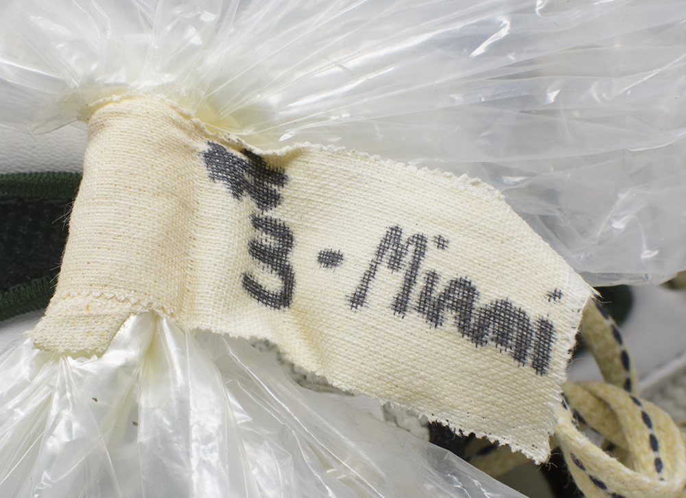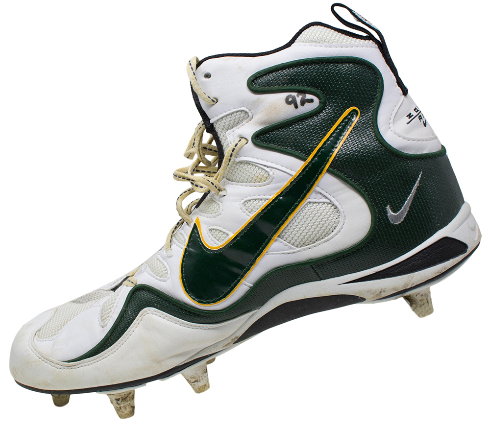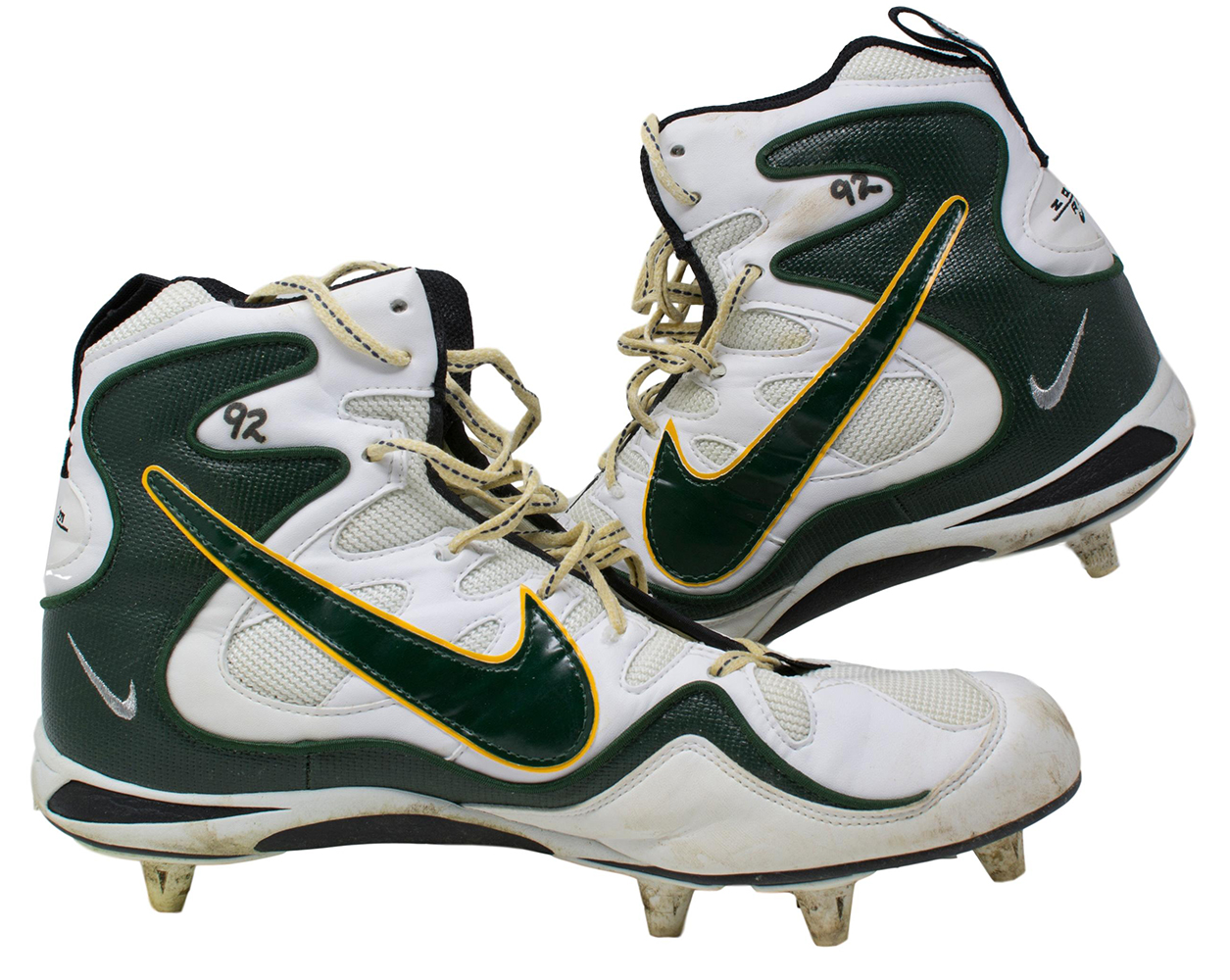 Nike High Top Zoom Air football cleats were game-worn by Reggie White and are a size 14. Each have Reggie White's number "92" written in black felt tip pen. Includes the original bag they were stored in.