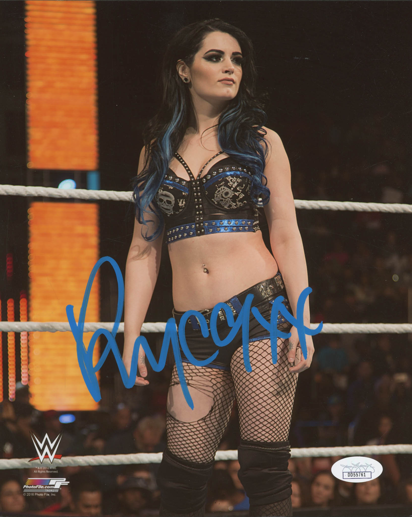 Photo measures 8" x 10" in size and has been hand-signed in blue paint pen by Paige (Saraya-Jade Bevis).