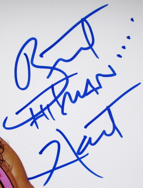 Photo measures 8" x 10" in size and has been hand-signed in blue felt-tip pen by Bret Hart.