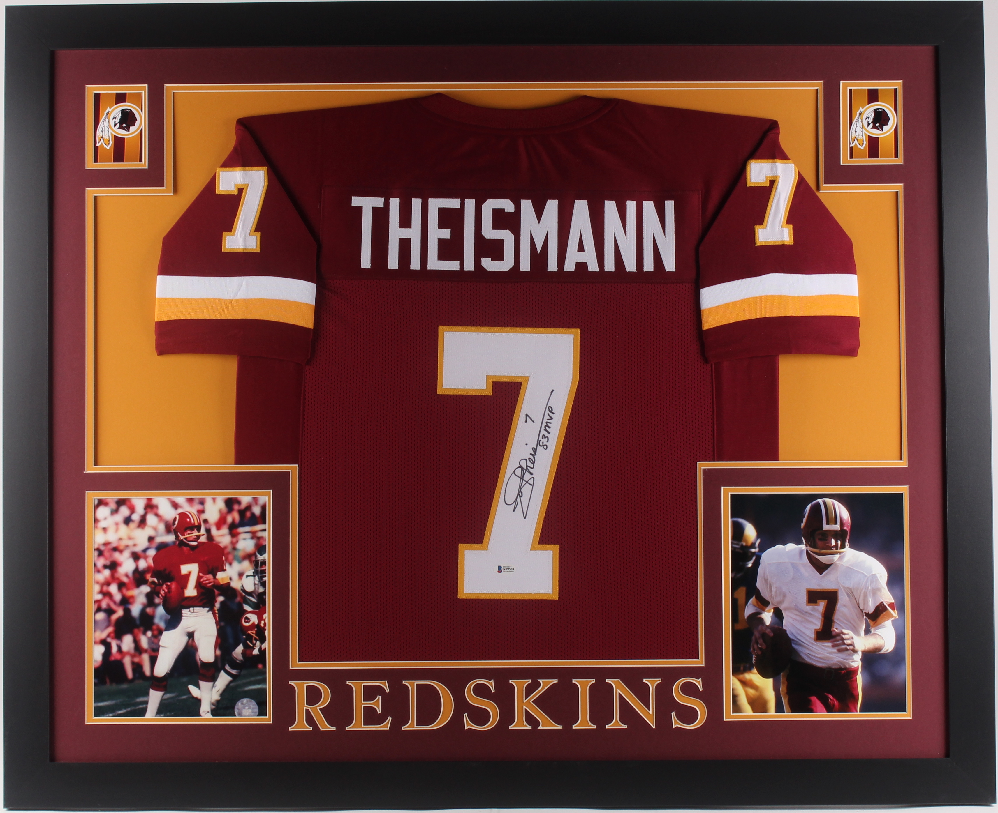 Custom frame measures approximately 35" x 43" in size and features a jersey which has been hand-signed and inscribed in black felt-tip pen by Joe Theismann.
