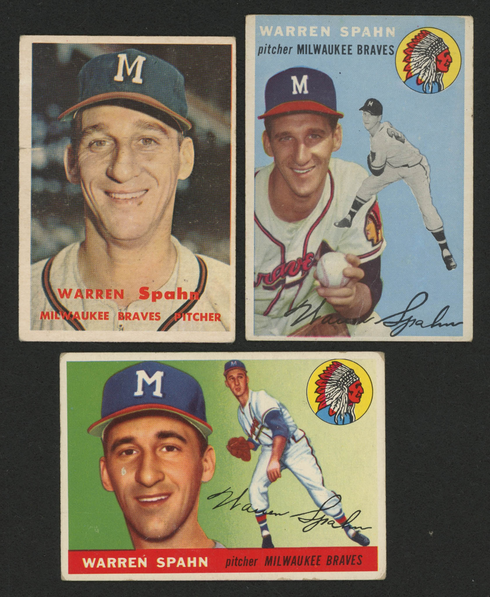 Lot of (3) Warren Spahn Baseball Cards with 1955 Topps #31, 1954 Topps #20 & 1957 Topps #90
