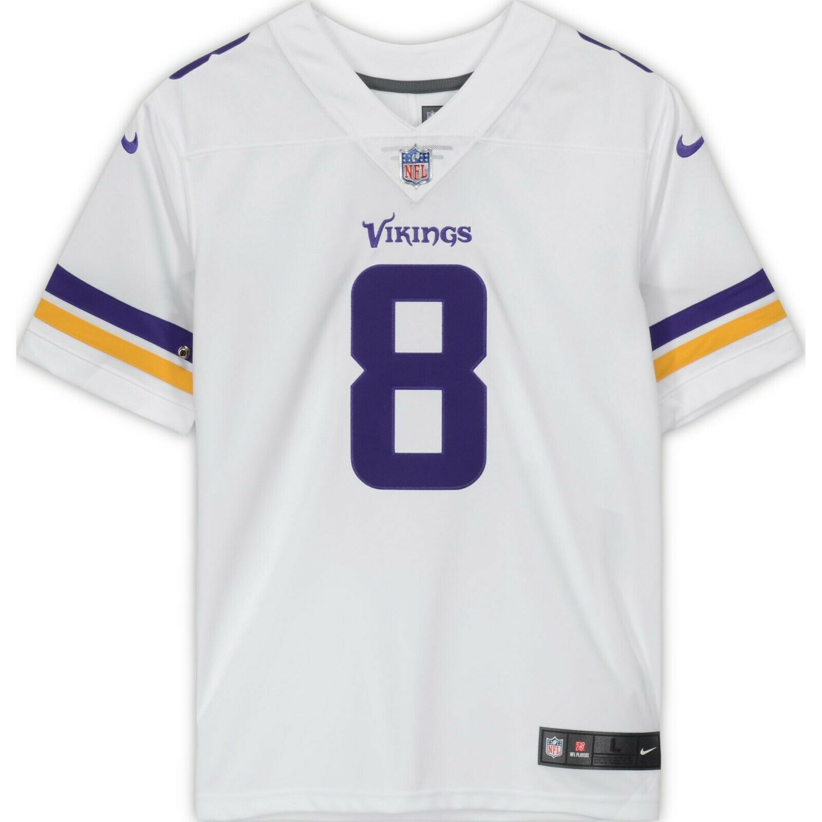 Nike on-field style jersey. Everything is sewn on, size L. Hand-signed in silver paint by Kirk Cousins.
