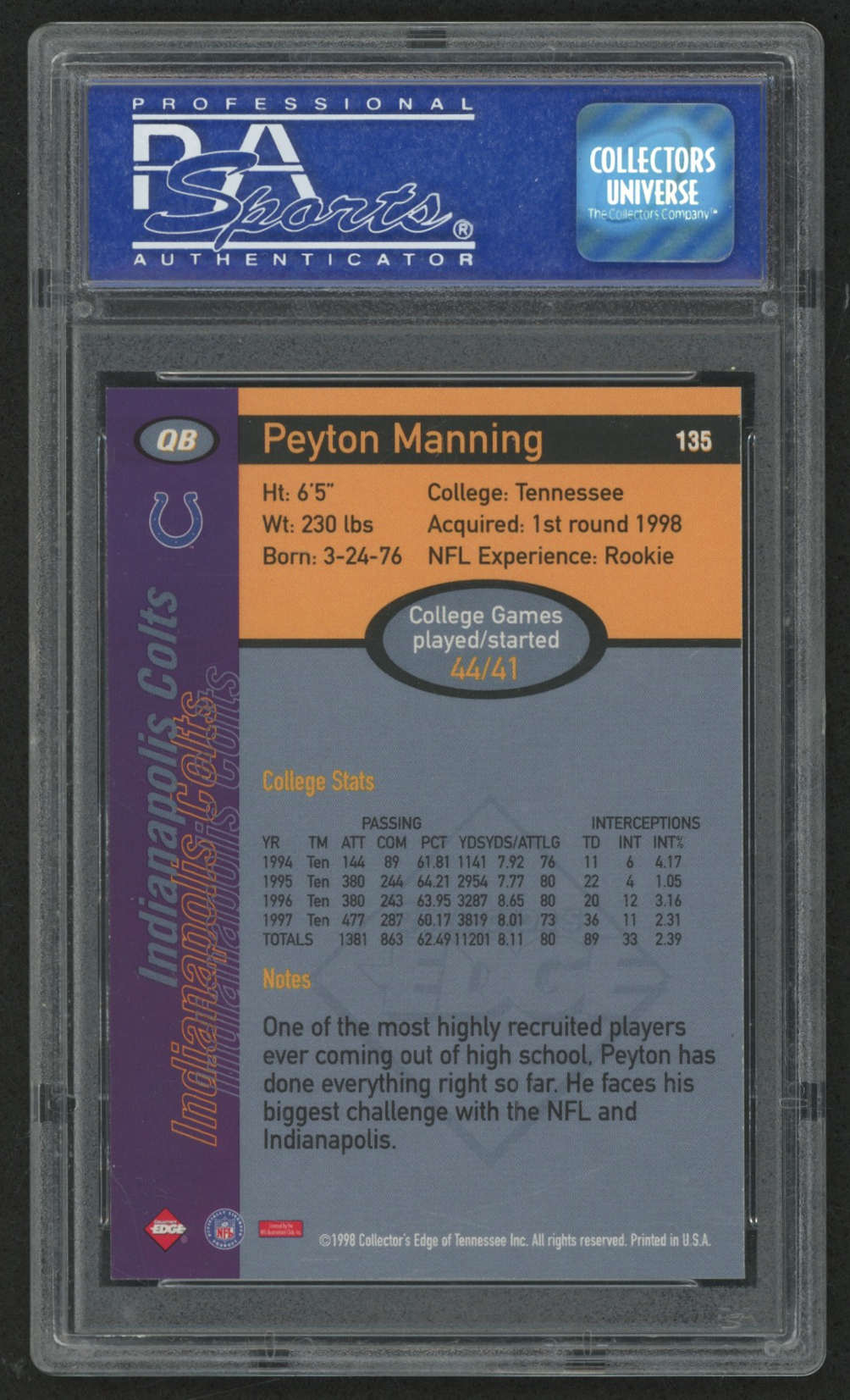 1998 Collector's Edge First Place #135 Peyton Manning RC (PSA 9)
