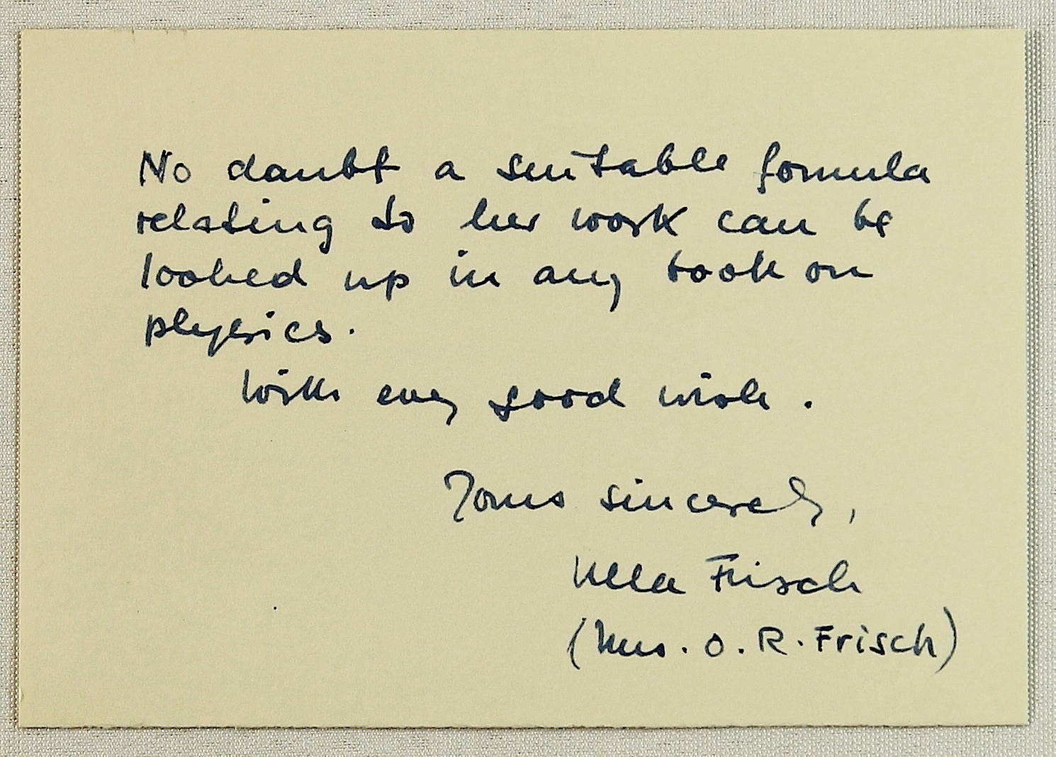 Cut measures 3.5" x 5" and has been hand-signed in blue felt-tip pen by Otto Robert Frisch, who worked with Lise Meitner on the team that discovered nuclear fission. The autograph includes an LOA and lifetime authenticity guarantee from Pristine Auction.