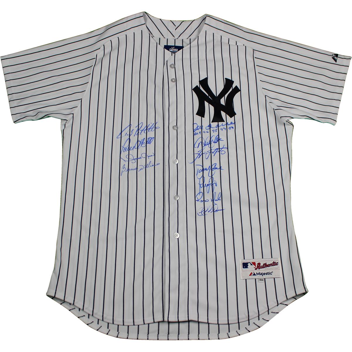 Majestic Authentic on-field style jersey, size 48. Hand-signed in blue felt-tip pen by (11) New York Yankees including: Joe Torre, Derek Jeter, Bernie Williams, Tino Martinez, Paul O'Neill, Luis Sojo, Ramiro Mendoza, Jeff Nelson, David Cone, Andy Pettitte, and Mariano Rivera. Hand-numbered limited edition #/10.