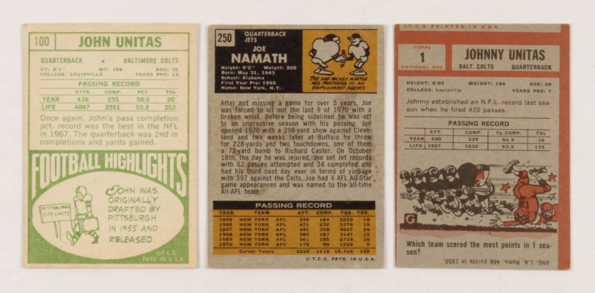 Lot of (3) Football Cards with 1962 Topps #1 Johnny Unitas, 1968 Topps #100 Johnny Unitas, & 1971 Topps #250 Joe Namath